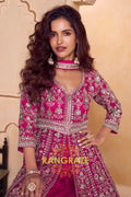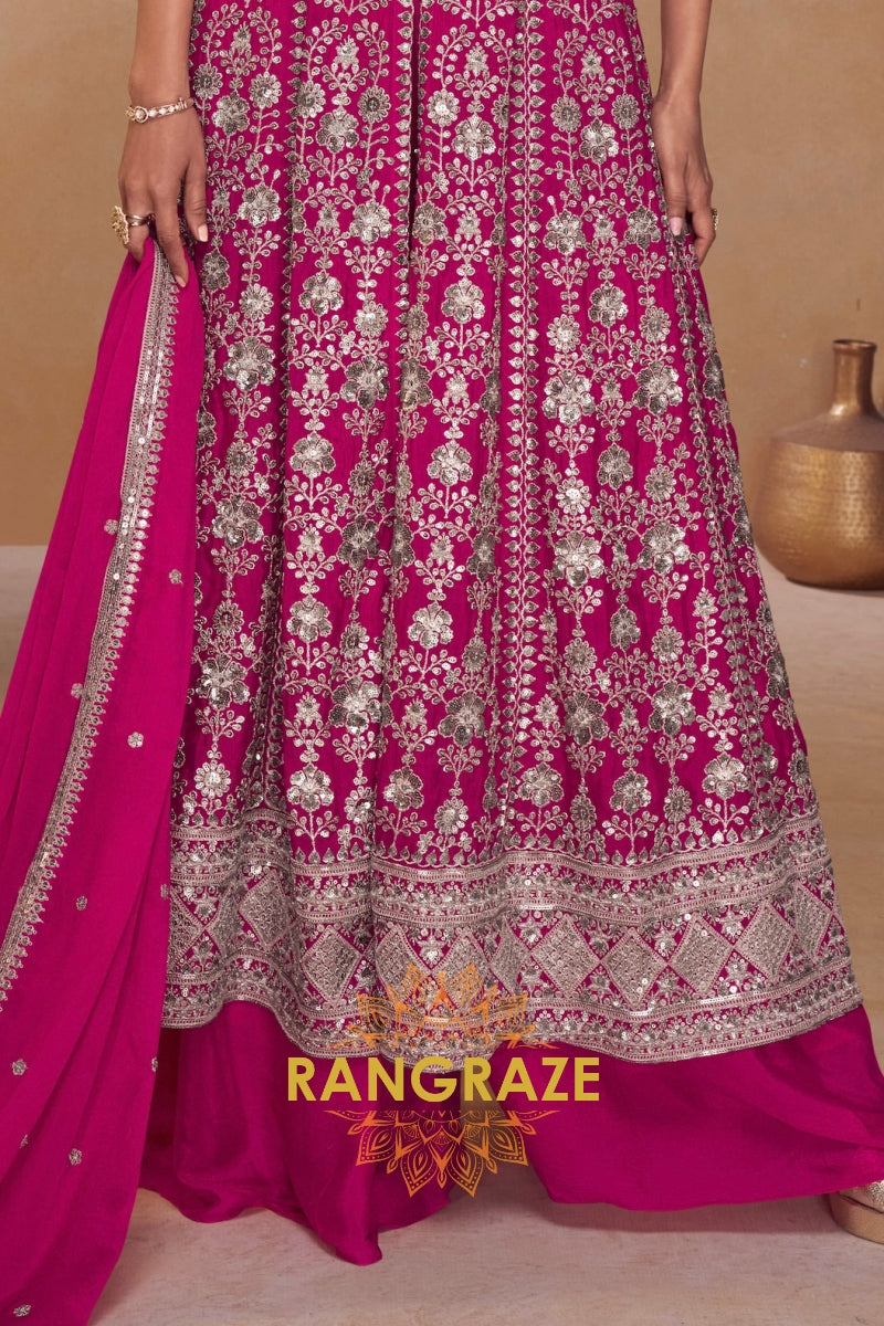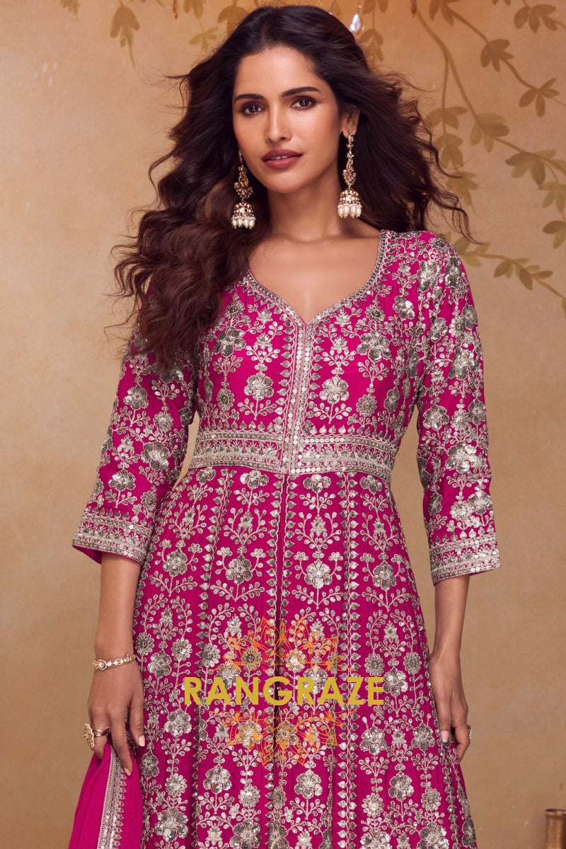 Make a bold and elegant statement with this Rani Pink Premium Chinon Embroidered Designer Suit Set from RangRaze. Crafted from luxurious premium chinon fabric, this ensemble features a soft, flowy drape enhanced with intricate golden embroidery that exudes festive richness and timeless charm.