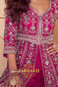 The kurta is beautifully adorned with detailed floral embroidery throughout, complemented by a structured bodice and ornate border work that highlights fine craftsmanship. The vibrant rani pink shade enhances the brilliance of the embroidery, creating a striking and regal look. Paired with a coordinated bottom and a matching dupatta with delicate embroidered borders, this outfit delivers a complete and graceful ethnic ensemble.