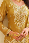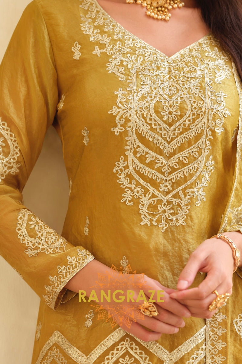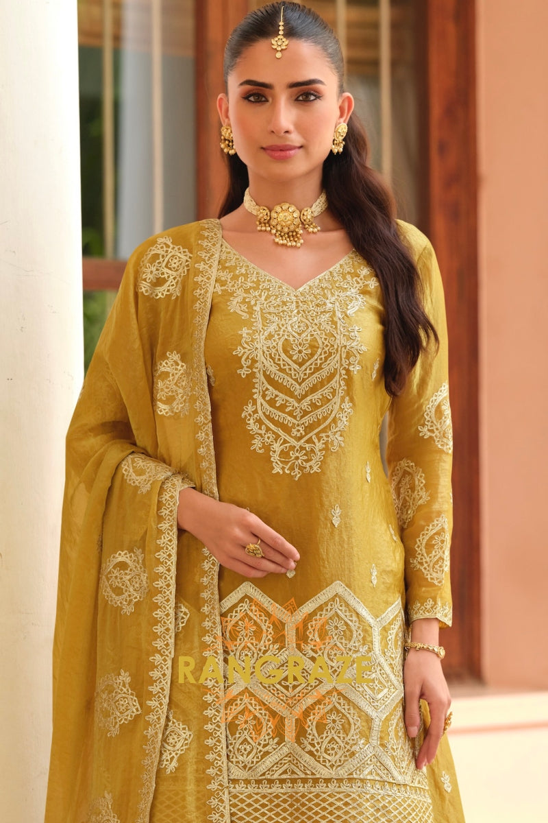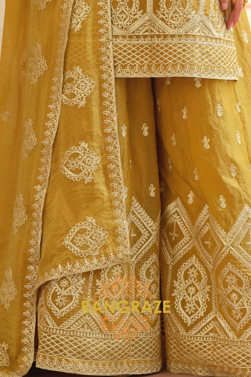 Celebrate timeless tradition with the RangRaze Sunehri Heritage Premium Silk Sharara Suit Set, a radiant ensemble crafted for weddings, festive ceremonies, and grand cultural occasions. Drenched in a regal mustard-gold hue, this sharara suit embodies classic elegance with rich artisanal detailing.