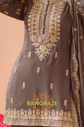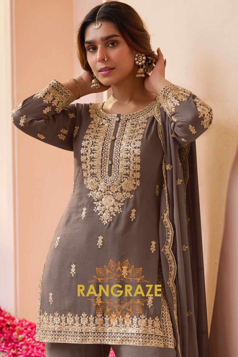 Step into effortless elegance with this Taupe Premium Chinon Embroidered Suit Set from RangRaze. Designed for refined festive dressing, this ensemble showcases the soft, flowy texture of premium chinon fabric paired with intricate golden embroidery that adds a rich and sophisticated appeal.
