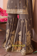The kurta features beautifully detailed embroidery around the neckline and hem, complemented by delicate motifs scattered across the fabric. The graceful taupe shade enhances the luxurious look of the outfit, while the coordinated embroidered sharara-style bottom and matching dupatta complete the ensemble with timeless charm.