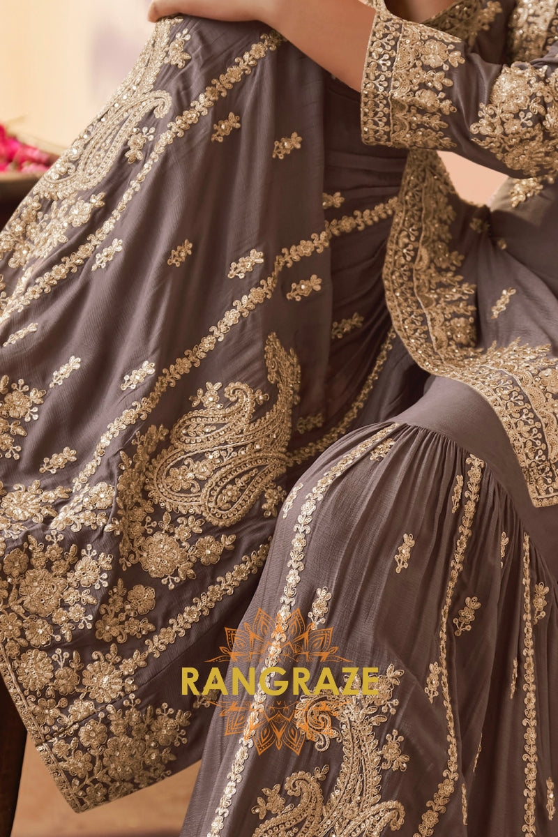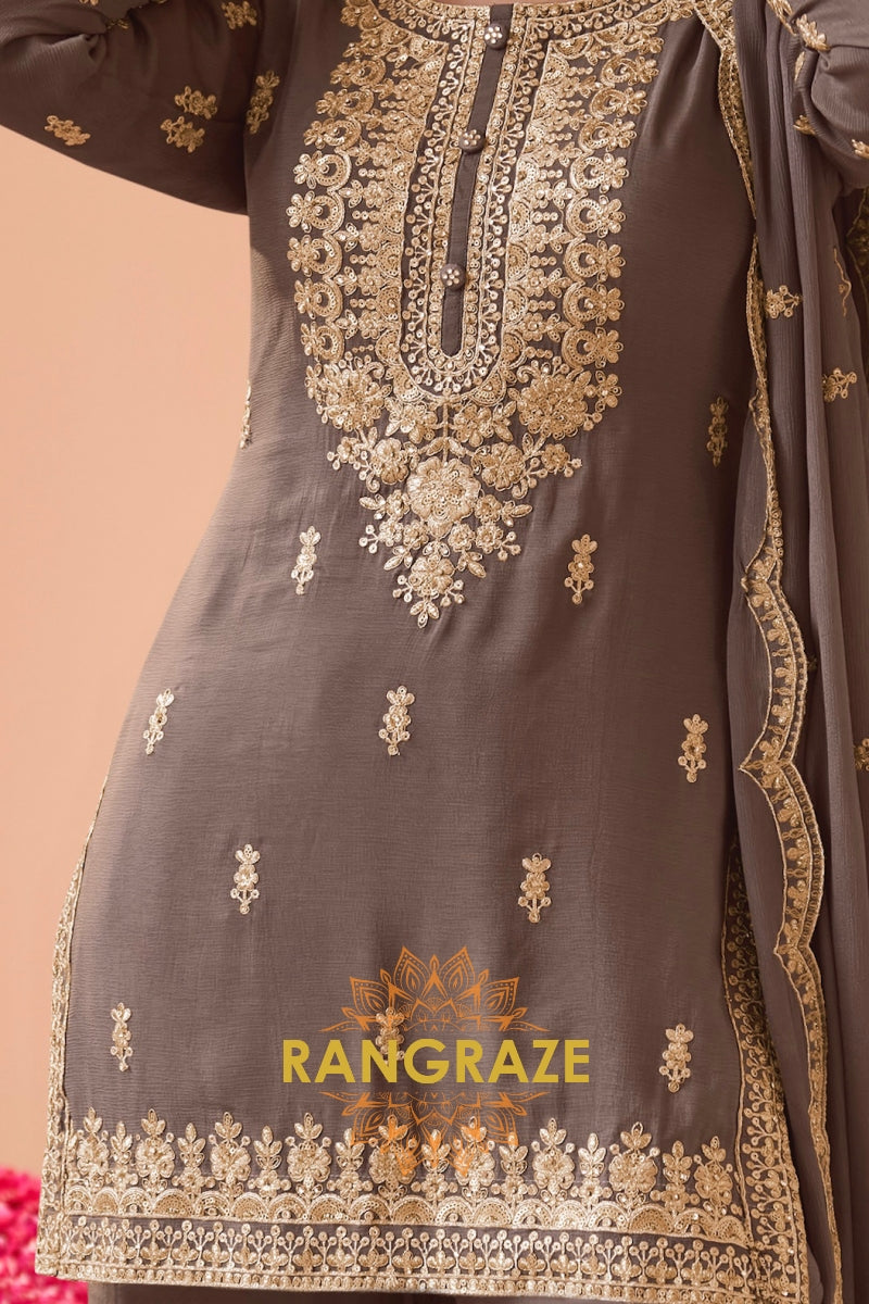 Taupe Premium Chinon Designer Embroidered Suit Set