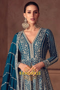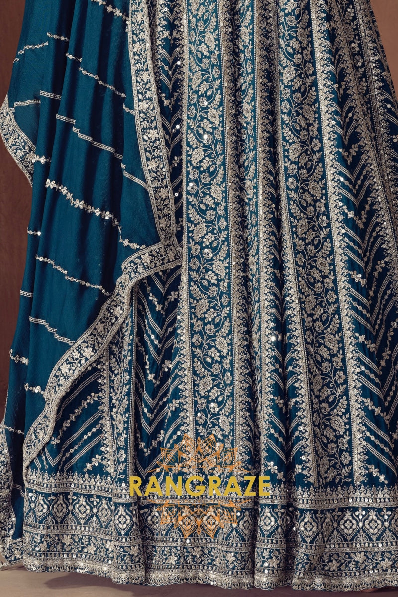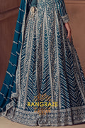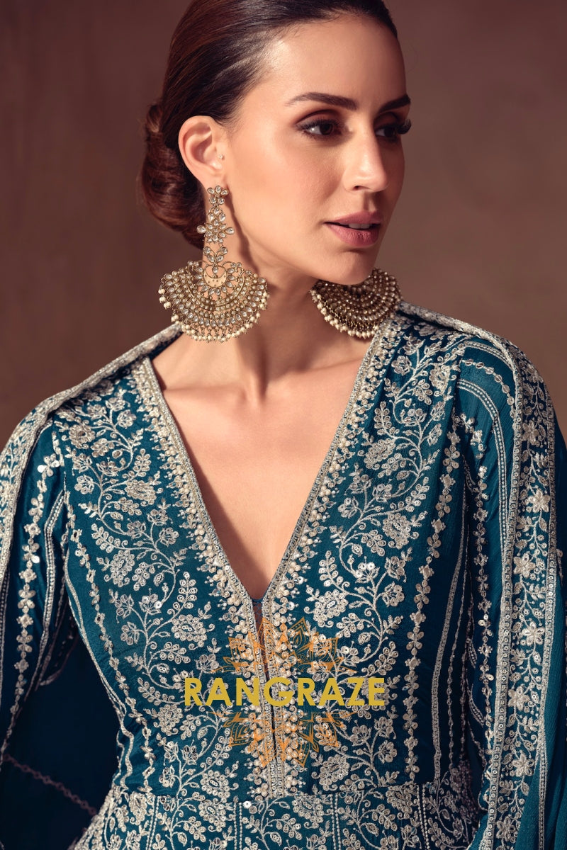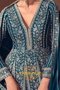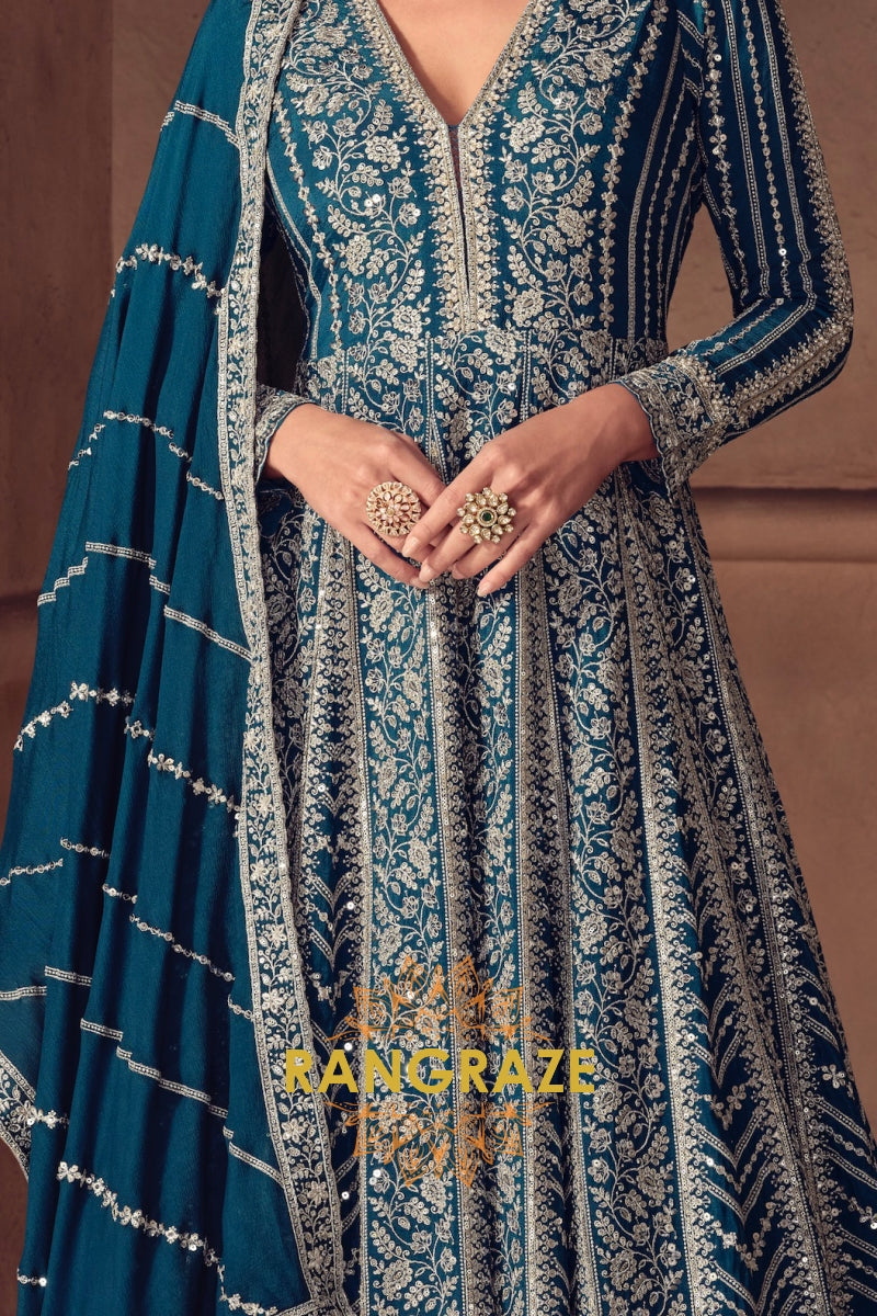 Unveil timeless grandeur with the RangRaze Mehr-E-Samundar Premium Chinon Heavily Embroidered Anarkali Suit Set, a masterpiece designed for weddings and elite festive occasions. Drenched in a deep teal blue hue, this ensemble exudes royal elegance with intricate craftsmanship that captures attention from every angle.