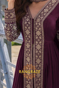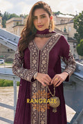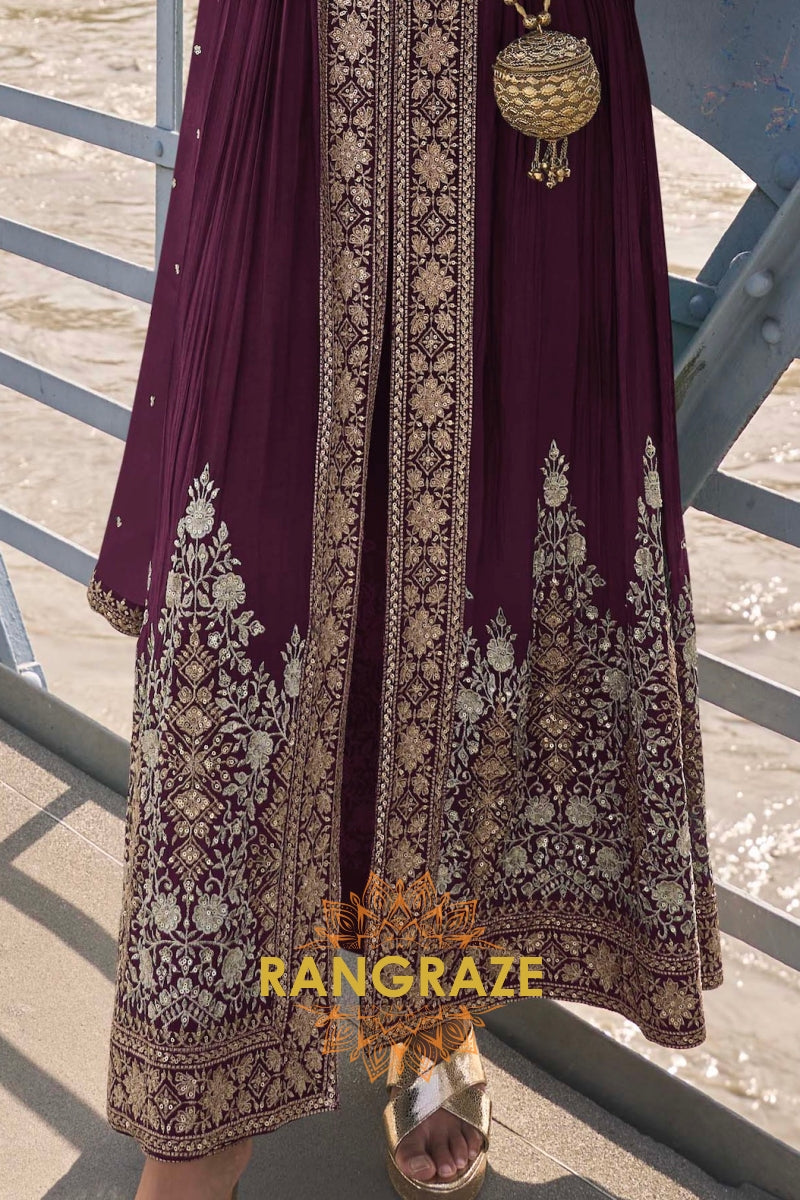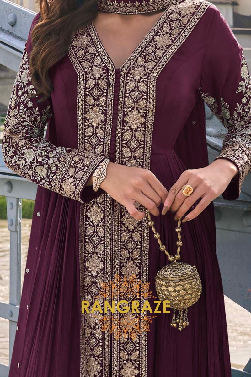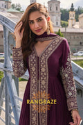 Exude timeless elegance with the RangRaze Wine Plum Pure Chinon Hand Embroidered Designer Suit Set, a statement ensemble crafted for refined festive and wedding occasions. Rendered in a rich wine-plum hue, this suit set reflects sophistication, depth, and classic grandeur.