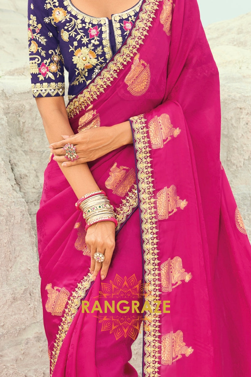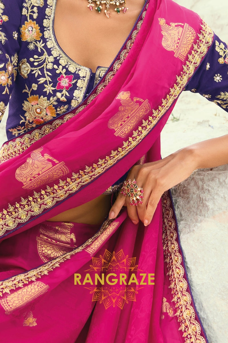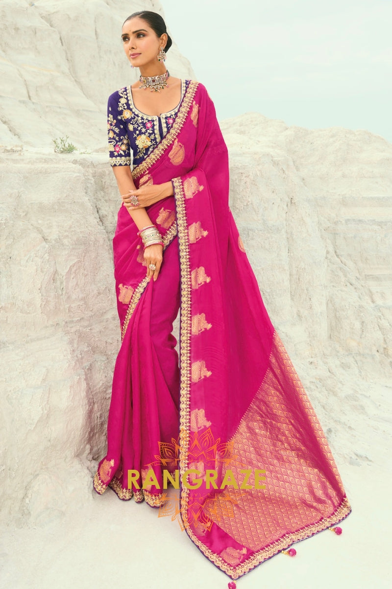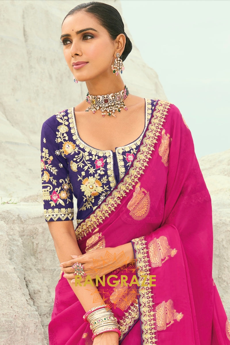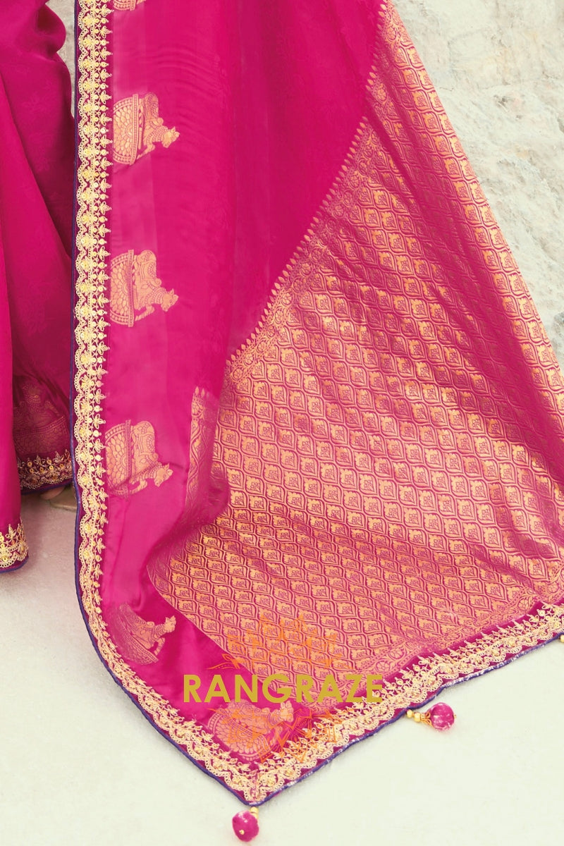 Drape yourself in timeless grandeur with this Rani Pink Designer Embroidered Saree, a striking ensemble that radiates regal charm and meticulous craftsmanship, making it perfect for weddings, receptions, and high-profile celebrations.