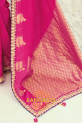 Crafted in a luxurious premium pure silk fabric, this vibrant rani pink saree is beautifully enhanced with elegant woven and embroidered motifs inspired by traditional heritage patterns. The saree features refined zari work, resham detailing, and subtle embellishments that lend a graceful sheen and rich texture. The designer pallu, highlighted with intricate weaving and decorative borders, adds depth and grandeur, flowing effortlessly with every drape.