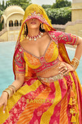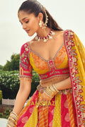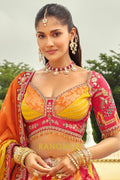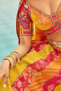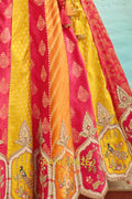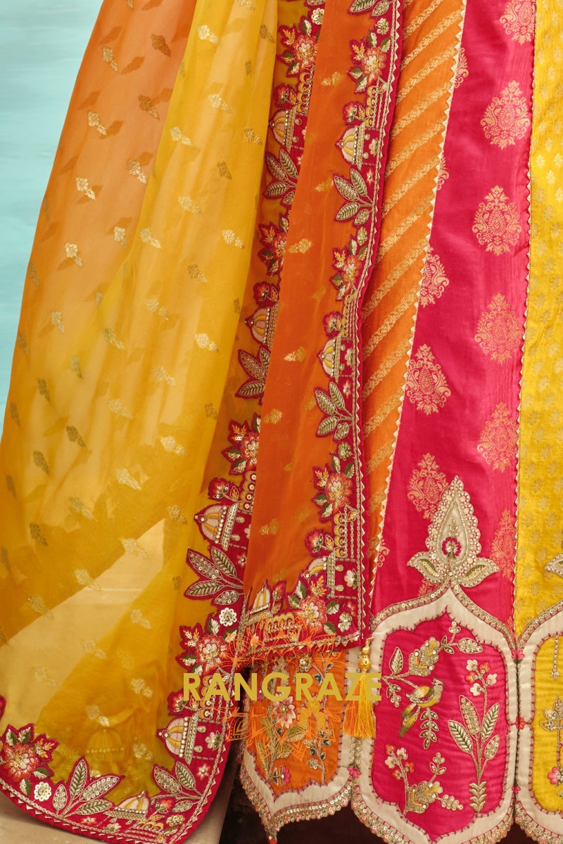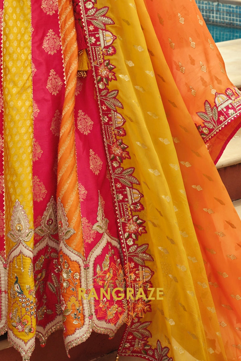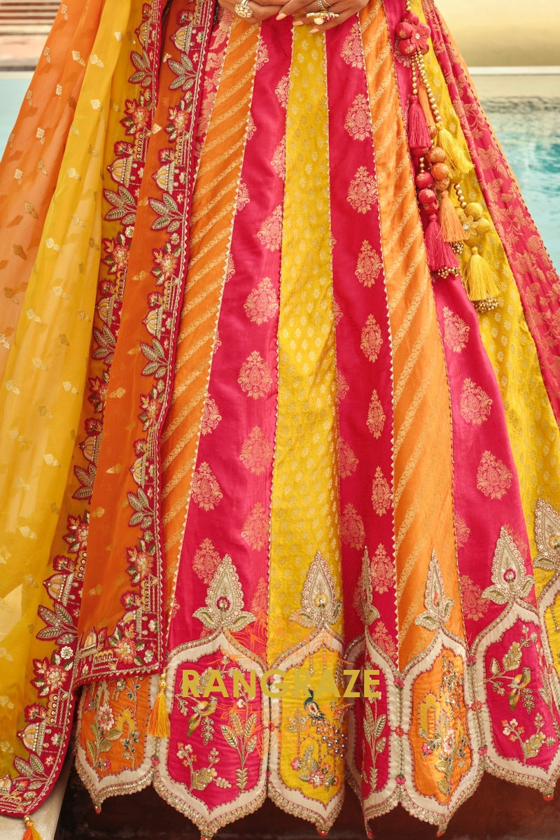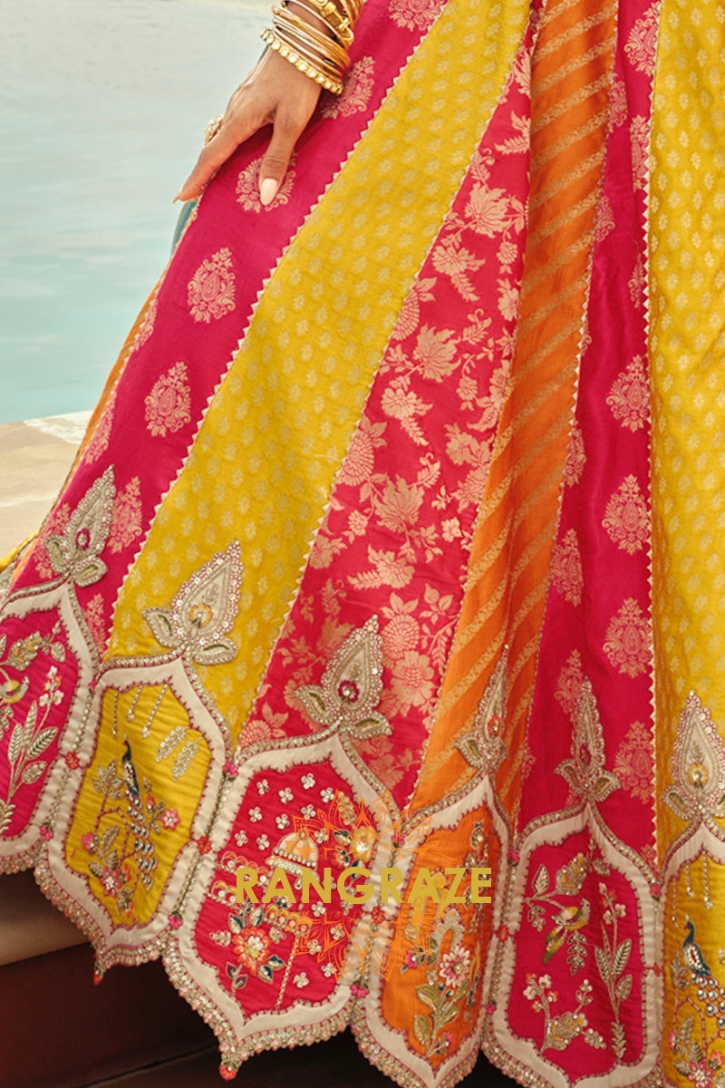 Designed in a striking combination of rani pink, mustard yellow, and warm orange panels, the lehenga features traditional motifs, florals, and heritage-inspired detailing. The design is elevated with heavy embroidery, weaving butti, artistic mirror work, and a beautifully crafted cut-work border that enhances its regal appeal. With a flattering 42-inch length and a graceful 3.50-meter flair, this ready-to-wear lehenga offers a majestic silhouette with effortless movement.