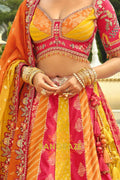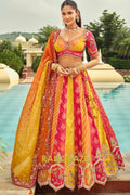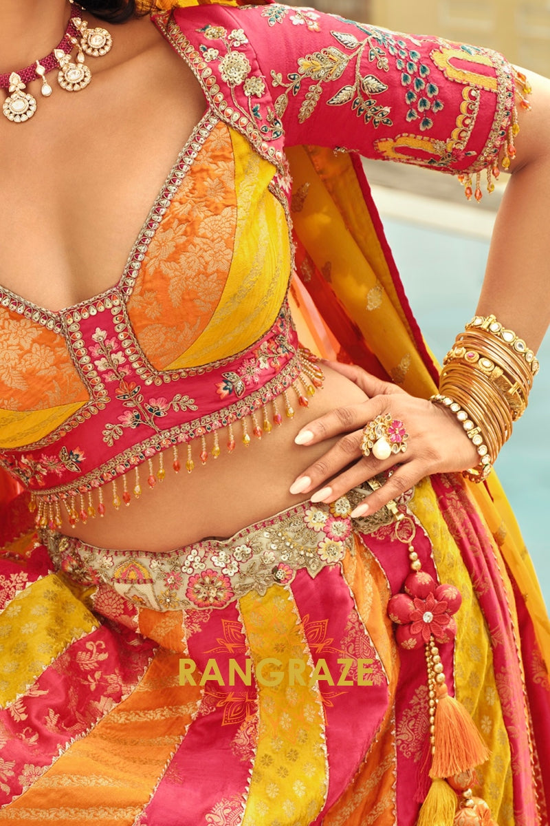 Make a bold festive statement with this Rani Pink & Mustard Panelled Ready-to-Wear Embroidered Lehenga, a vibrant ensemble that celebrates rich Indian hues and intricate craftsmanship, perfect for weddings and grand celebrations.