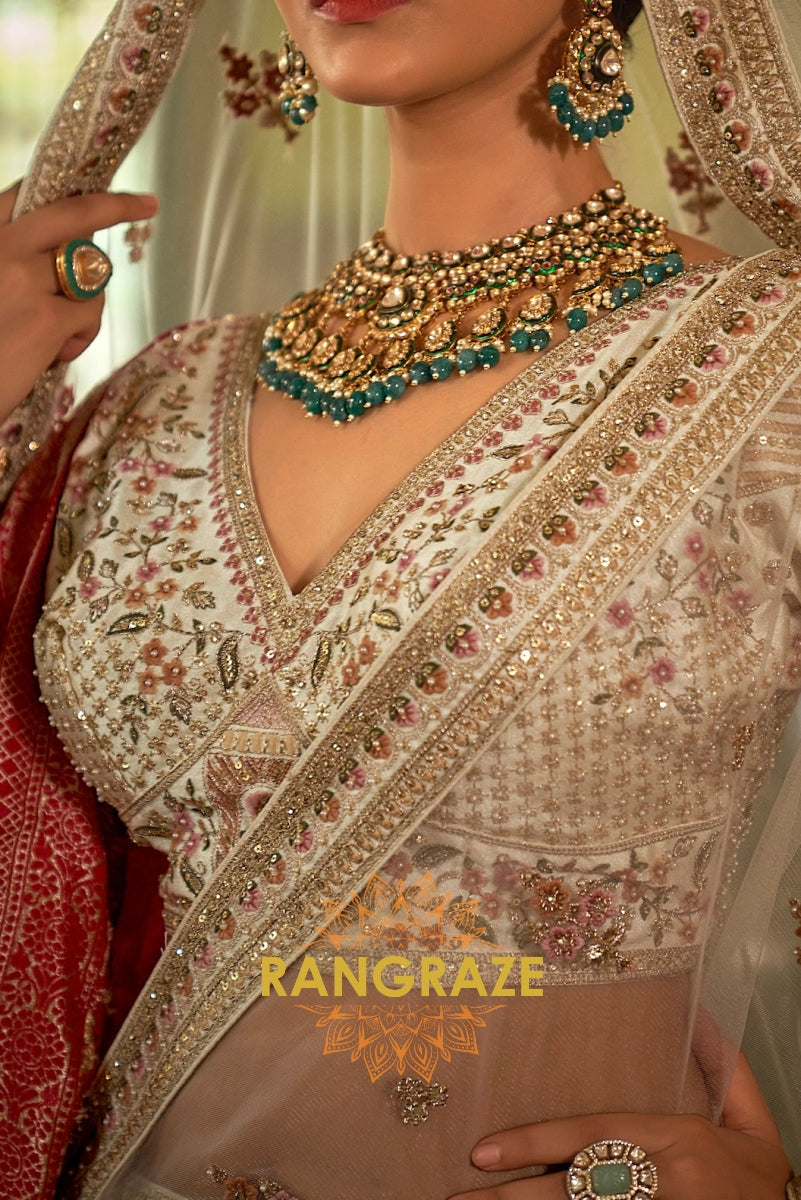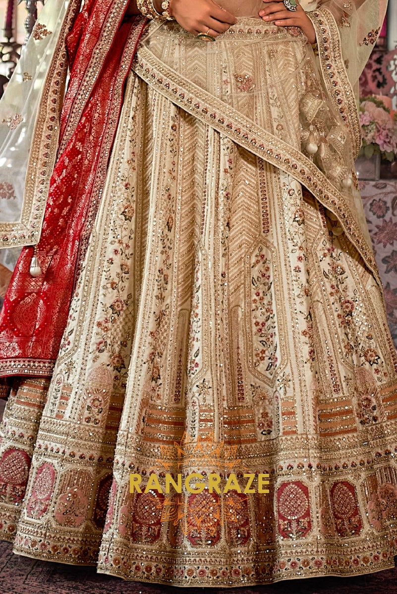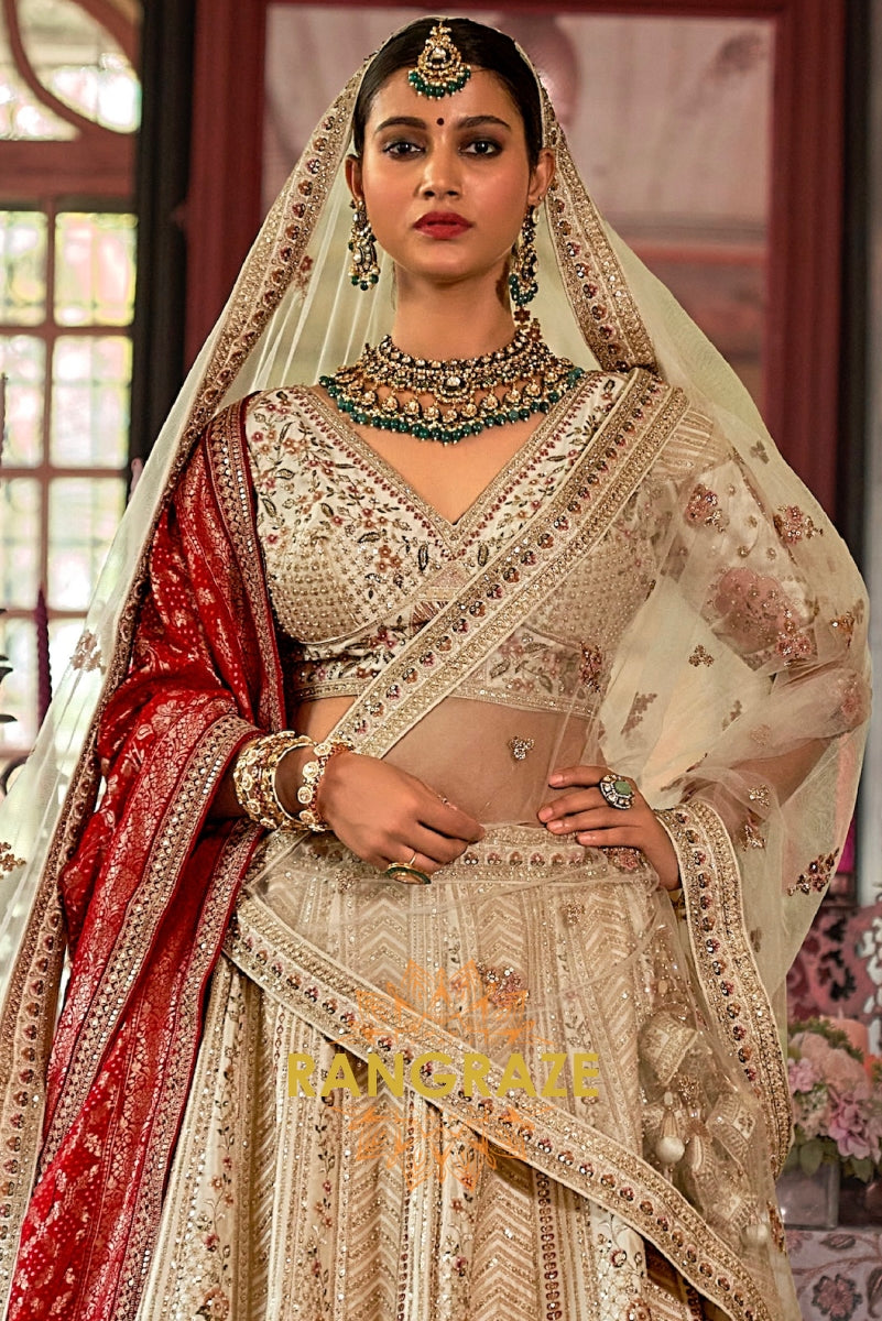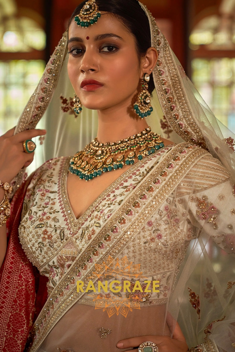 Step into ethereal elegance with the Regal Ivory & Rouge Double-Dupatta Bridal Silk Lehenga, an exquisite creation inspired by Sabyasachi’s timeless artistry. Crafted for the modern bride who treasures heritage yet desires sophistication, this lehenga radiates divine charm and cultural grandeur.