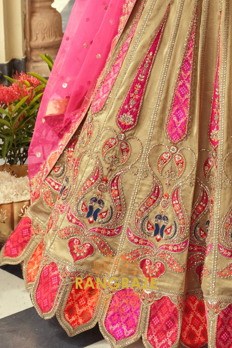 Crafted in an elegant rose gold base, the lehenga is adorned with rich fuchsia accents and intricate traditional motifs inspired by heritage artistry. Heavy embroidery is elevated with weaving butti, artistic mirror work, and a finely finished cut-work border that adds depth and grandeur. Featuring a flattering 42-inch length and a graceful 3.50-meter flair, this ready-to-wear lehenga creates a majestic silhouette with effortless movement.