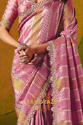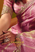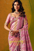 Paired with a matching stitched blouse, the blouse showcases intricate embroidery and a classic cut that perfectly complements the saree’s refined appeal. The soft pink hue combined with delicate detailing makes this ensemble an exquisite choice for weddings, festive celebrations, receptions, and special occasions.