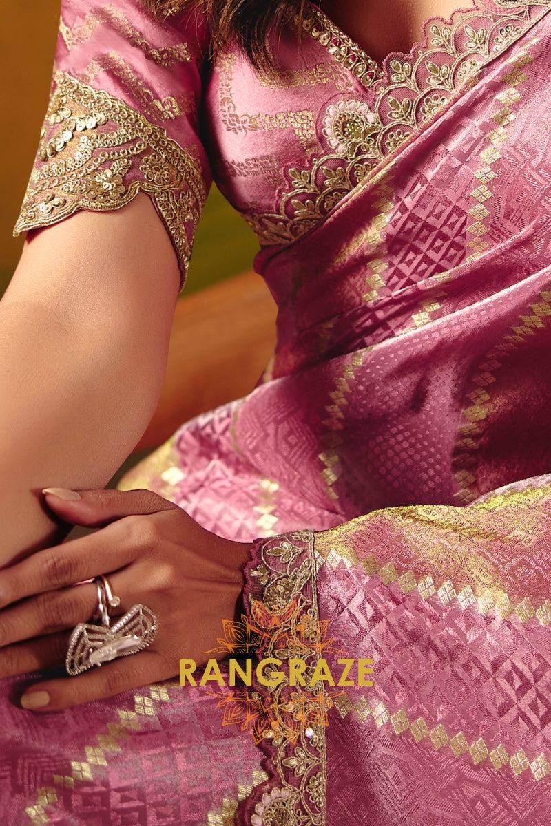 Celebrate timeless beauty with this rose pink designer saree crafted in luxurious soft silk. The saree features a rich woven texture highlighted with elegant gold-toned patterns and finished with a finely embroidered border that enhances its graceful drape.