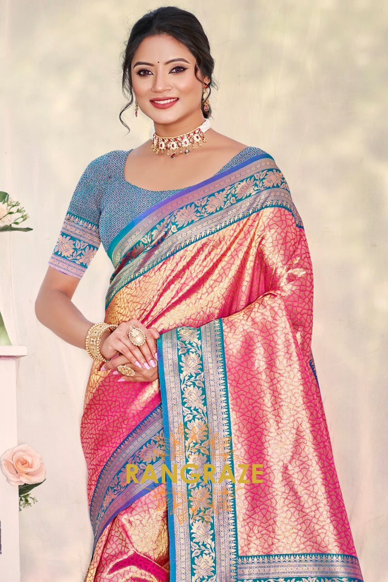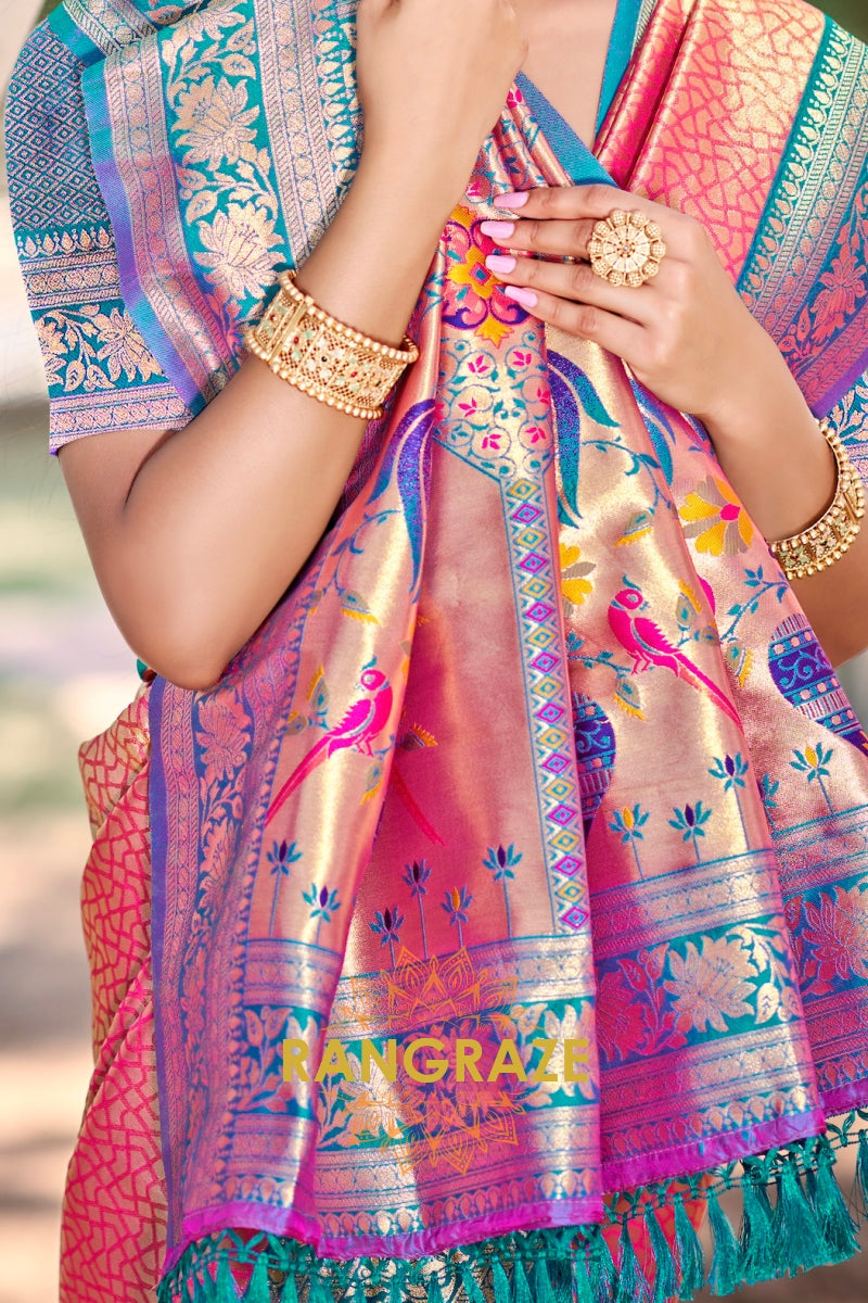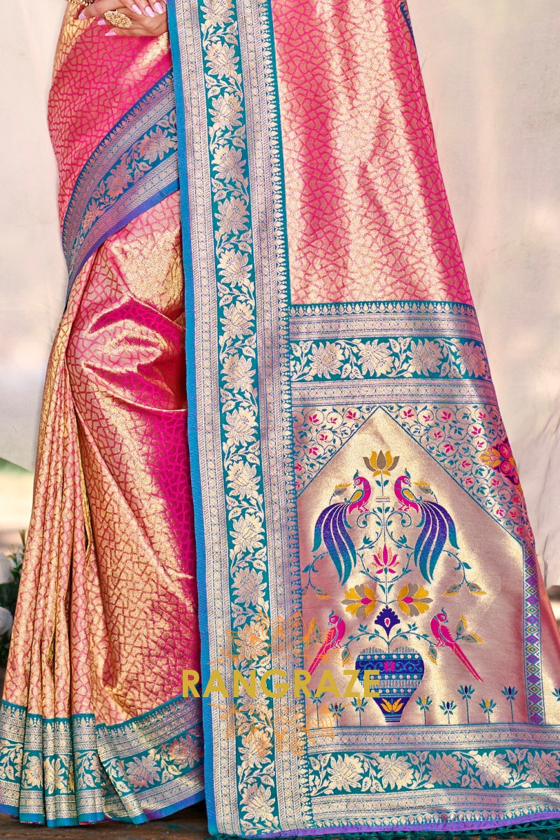 Rose Pink Paithani Inspired Silk Saree with Blue Zari Border
