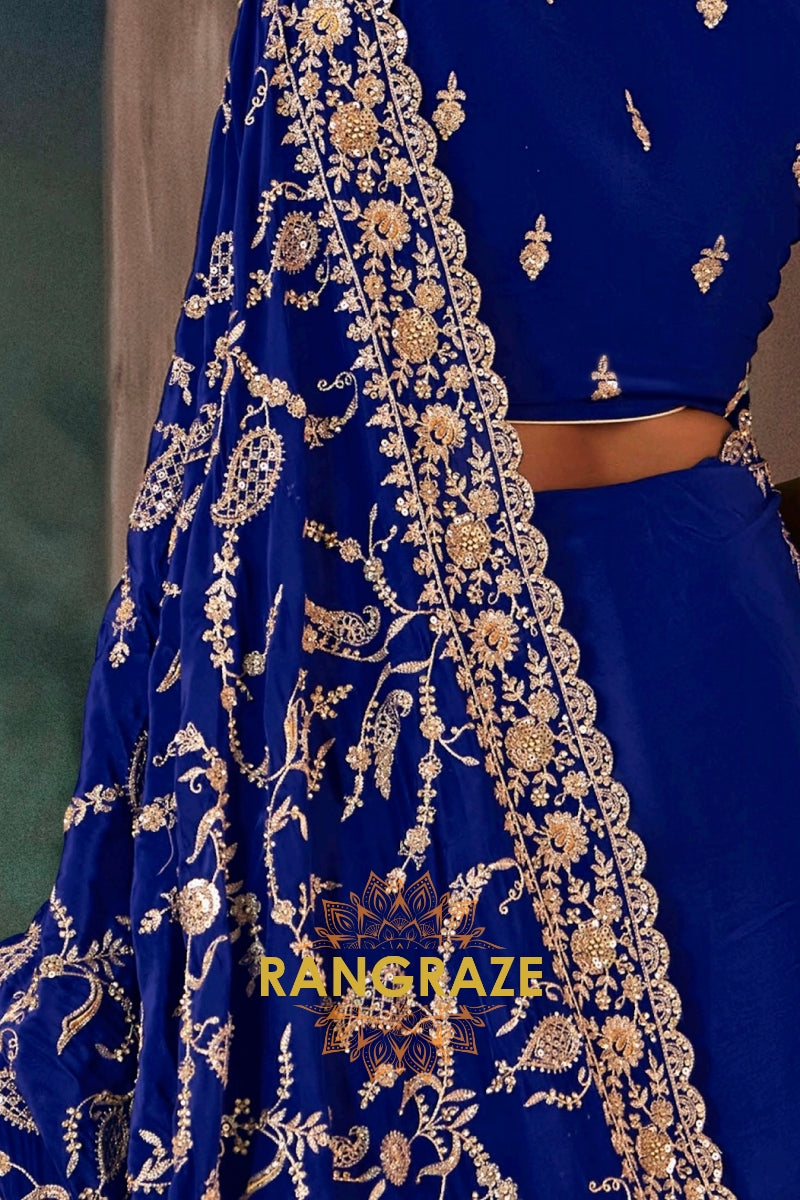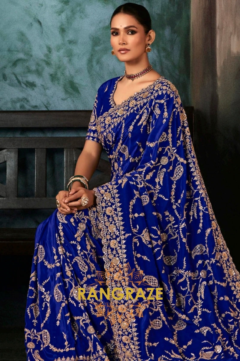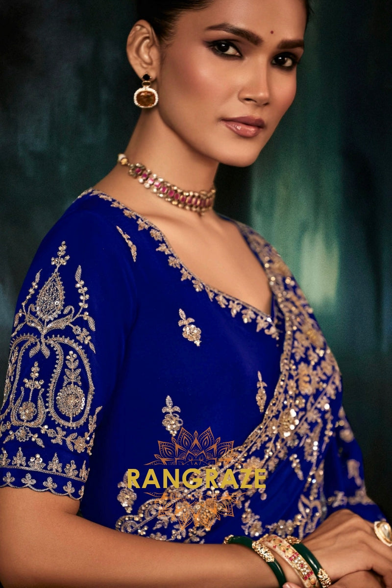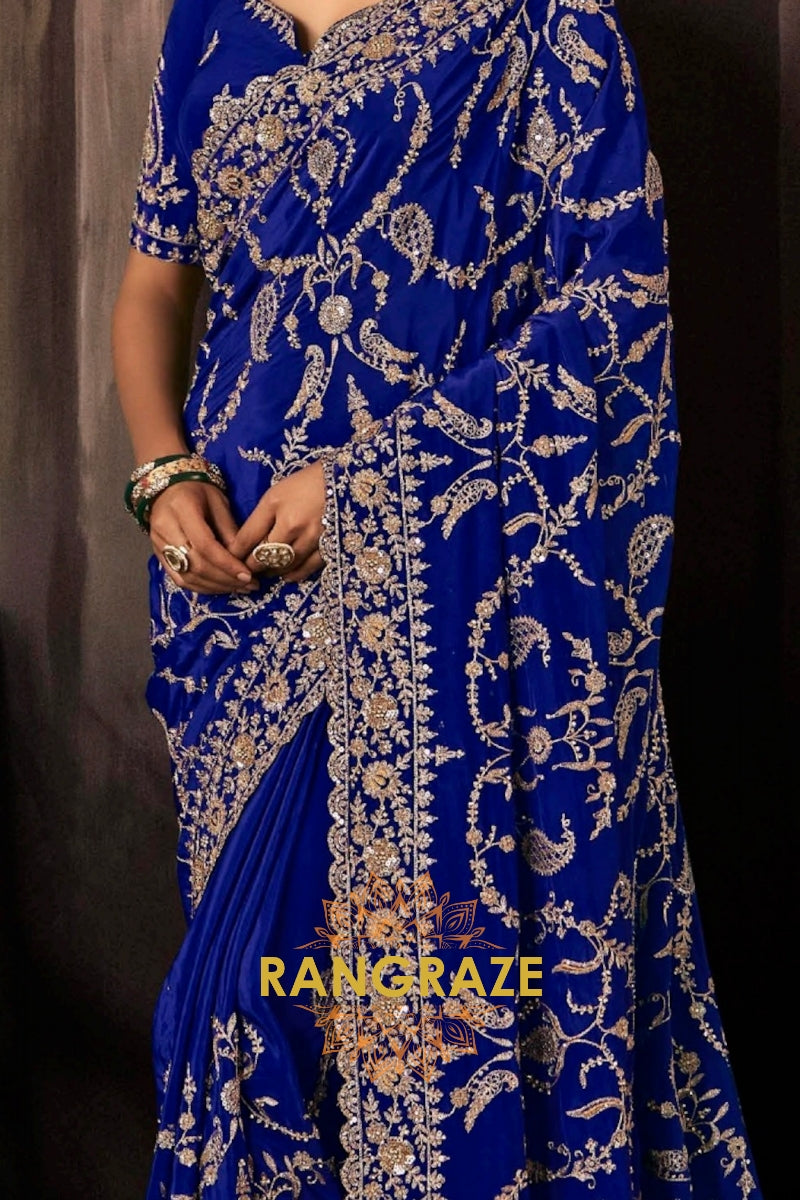 Drape yourself in timeless grandeur with this Royal Blue Designer Embroidered Saree, a statement ensemble that embodies regal elegance and meticulous craftsmanship, perfect for weddings, receptions, and high-profile celebrations.