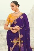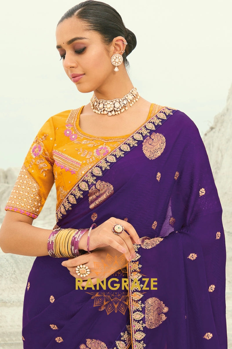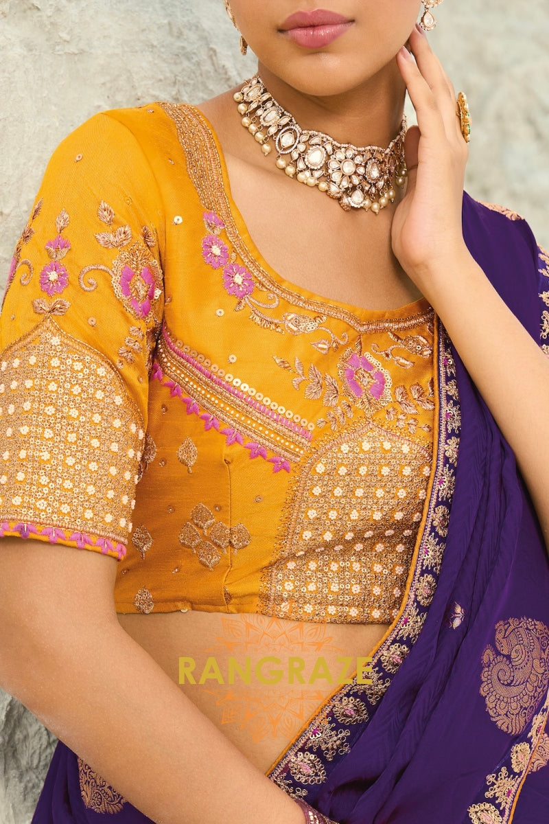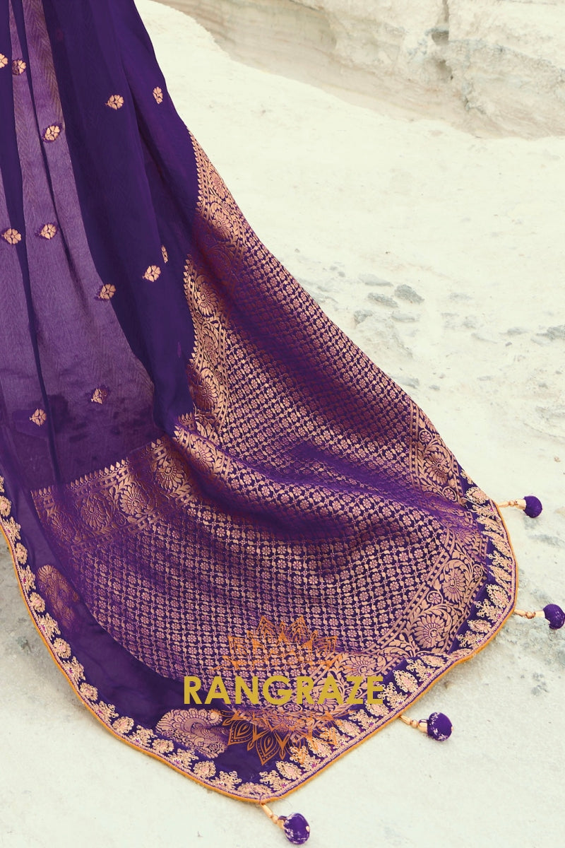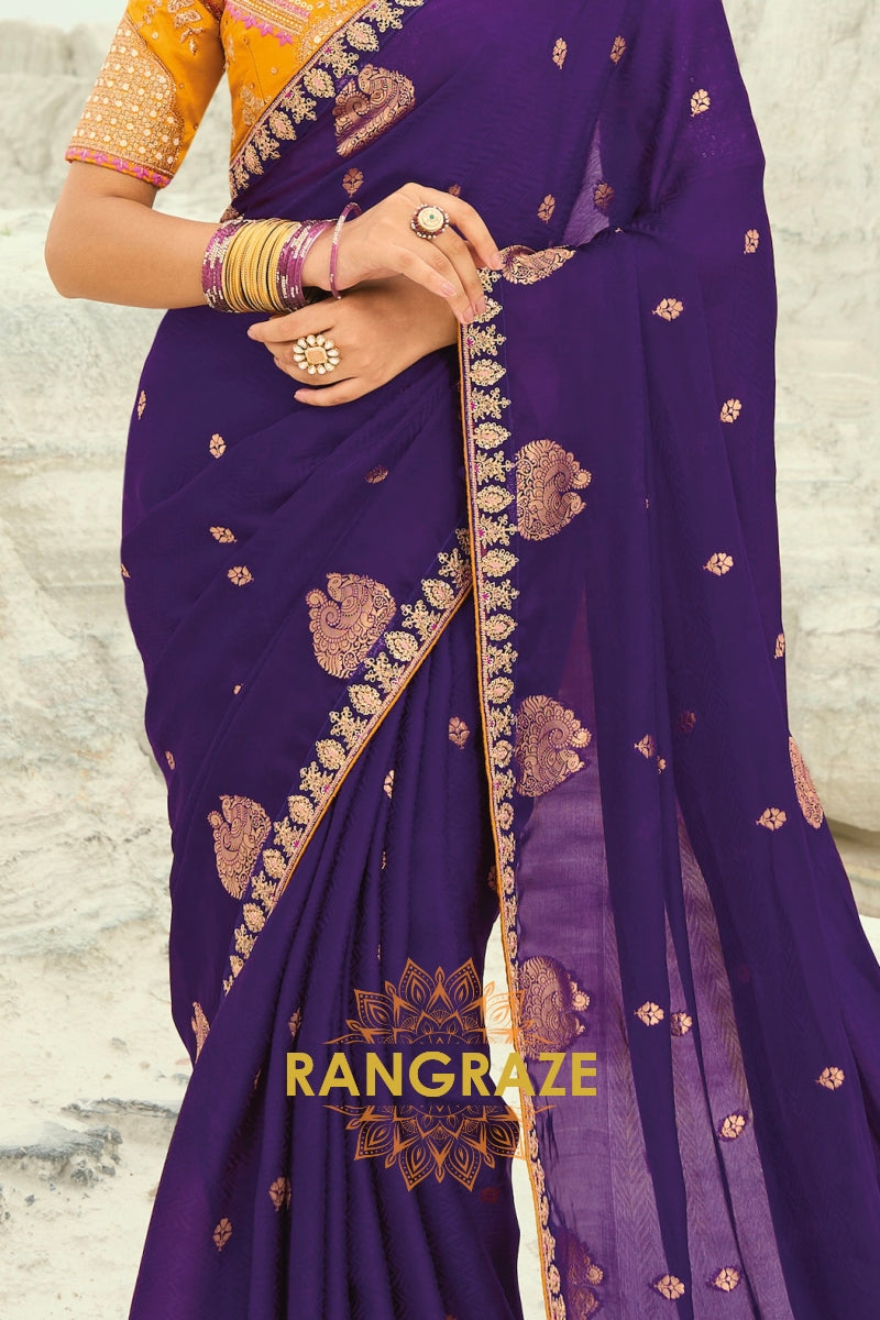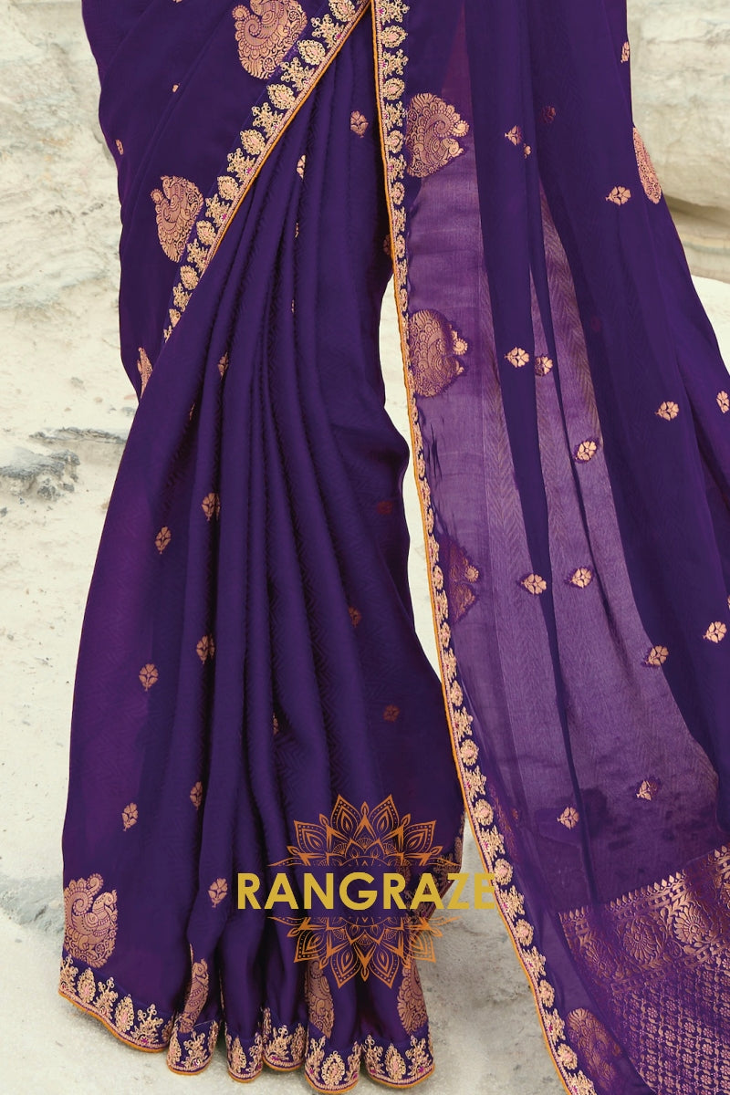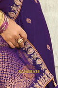 Drape yourself in timeless grandeur with this Royal Purple Pure Silk Designer Embroidered Saree, a majestic ensemble that radiates regal charm and refined craftsmanship, perfect for weddings, receptions, and luxurious festive occasions.