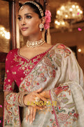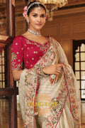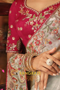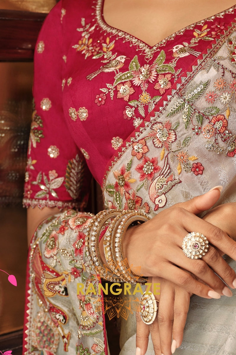 The ensemble is paired with a striking contrast blouse in deep magenta, embellished with floral embroidery and subtle sequin highlights, adding richness and charm to the look. A perfect harmony of elegance and tradition, this saree is an ideal choice for weddings, receptions, and festive soirées.