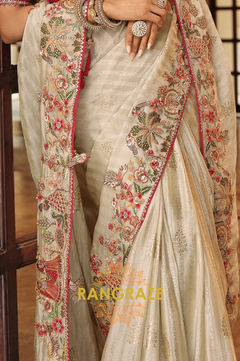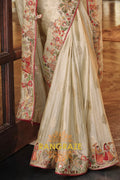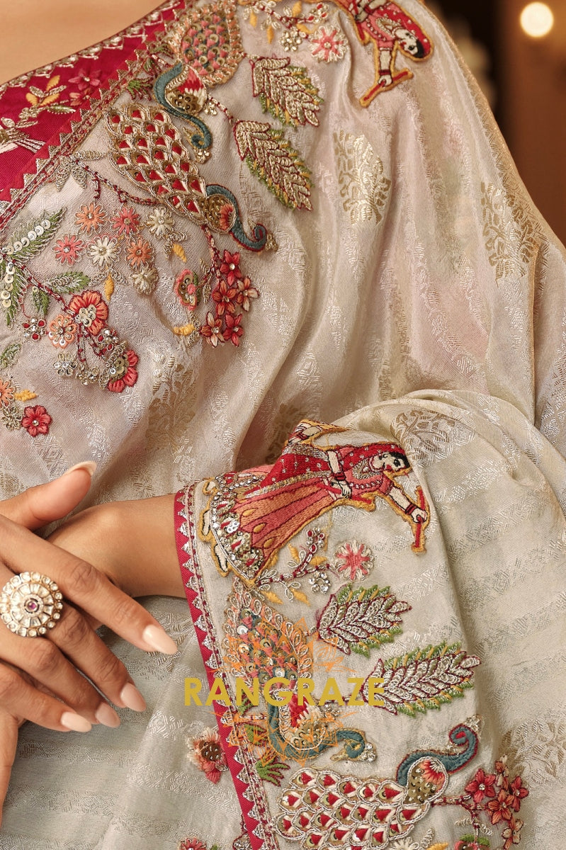 Elevate your festive wardrobe with the Royal Ivory Grace Embroidered Silk Saree. This exquisite drape, crafted in a soft ivory hue, is adorned with intricate multi-colored embroidery featuring peacocks, florals, and regal motifs along the border and pallu. The artistry is further enhanced with delicate zari accents and fine threadwork, lending it a sophisticated grandeur.