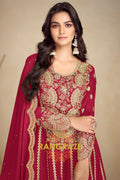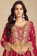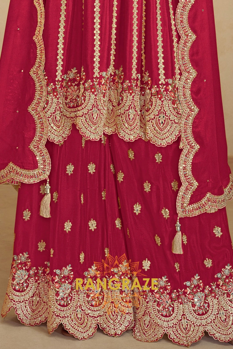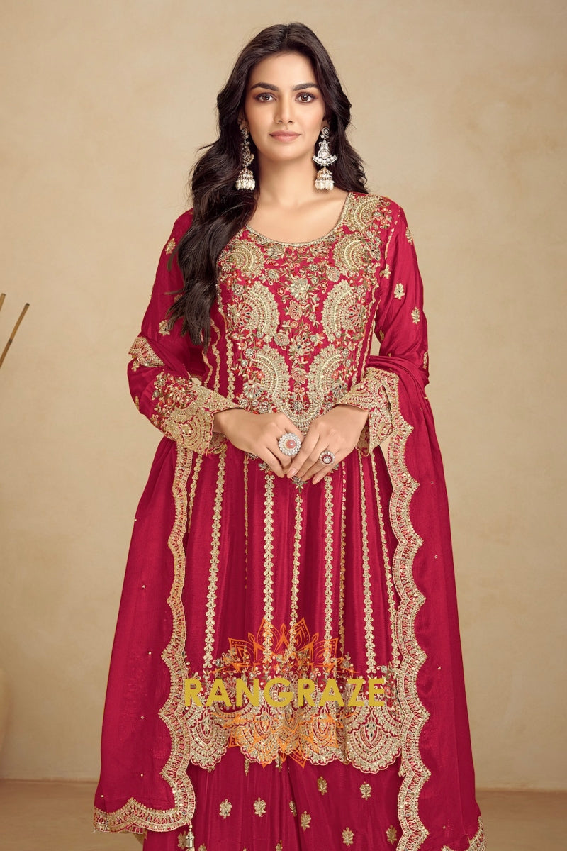 Make a regal statement with this Ruby Royale Premium Chinon Suit Set, crafted to embody grandeur and timeless elegance. Designed in luxurious premium chinon fabric, this ensemble features a rich ruby red hue adorned with intricate zari, thread, and sequin embroidery that radiates festive opulence.