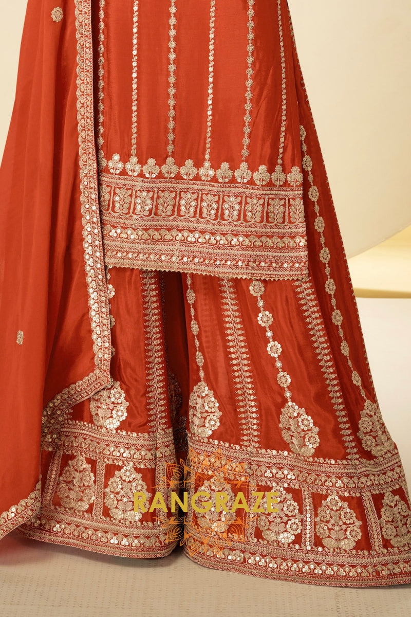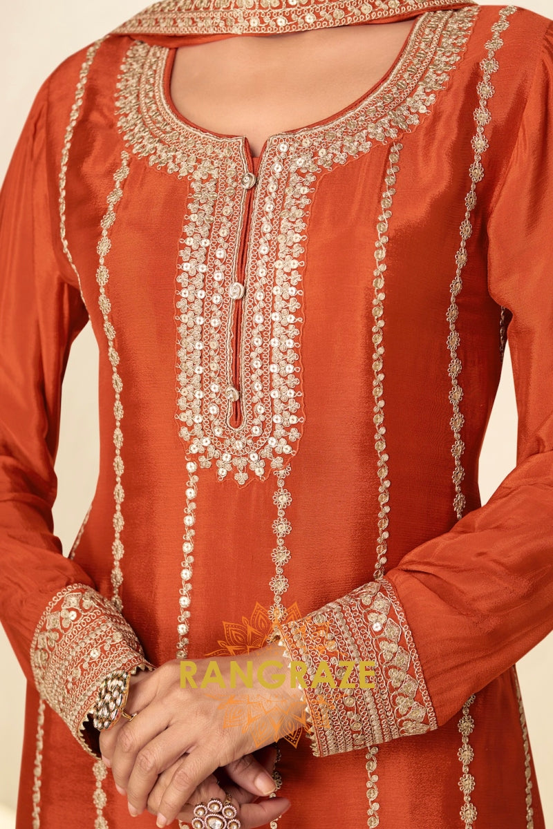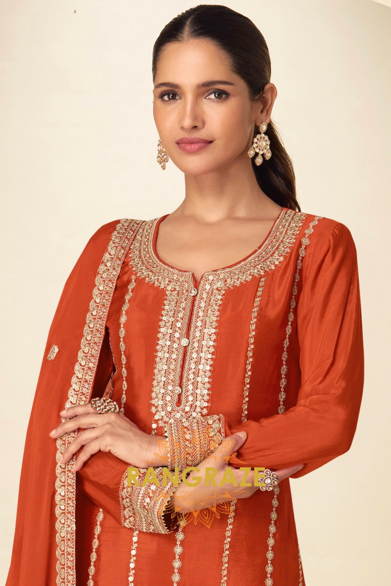 Rust Orange Embroidered Premium Chinon Palazzo Suit Set