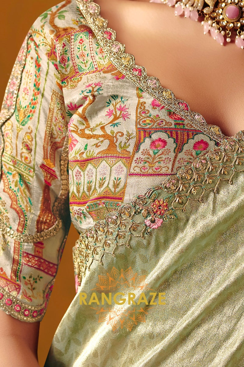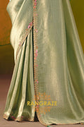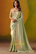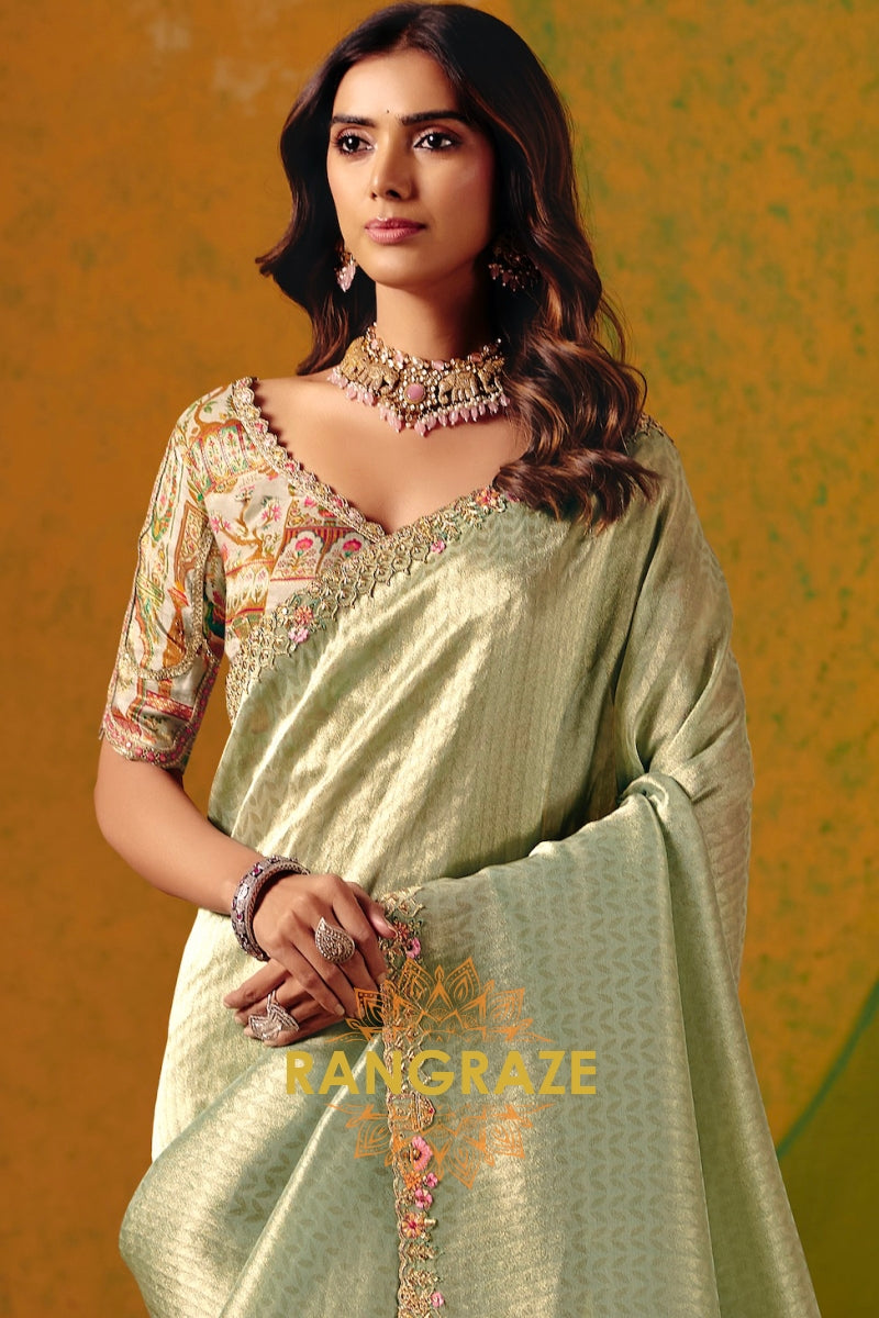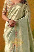 Paired with a beautifully stitched blouse, the blouse showcases intricate embroidery with a classic neckline and detailed sleeves, perfectly complementing the saree’s understated elegance. The soothing green tone and fine craftsmanship make this saree an ideal choice for weddings, festive occasions, and intimate celebrations.