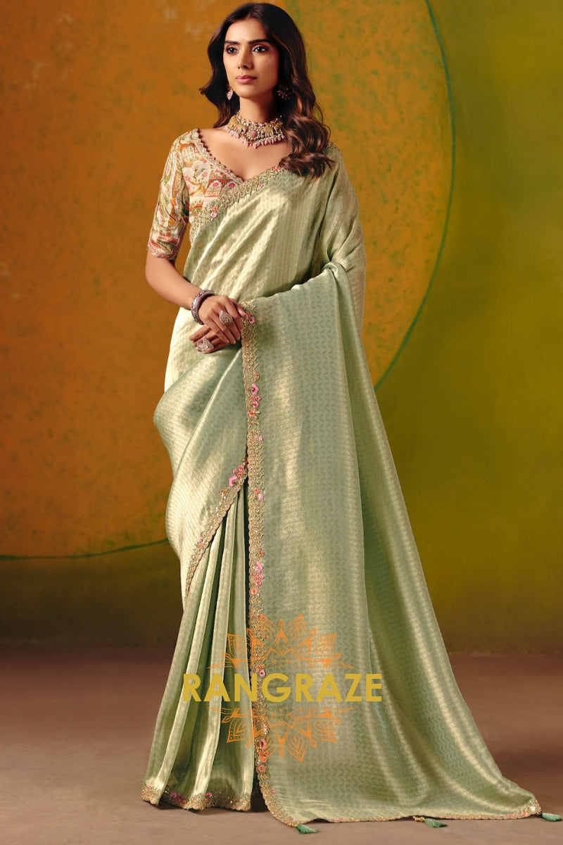 Elevate your ethnic wardrobe with this sage green designer saree crafted in luxurious soft silk. The saree features a subtle woven texture with a gentle sheen, enhanced by delicate floral embroidery along the border that adds a refined and graceful finish.
