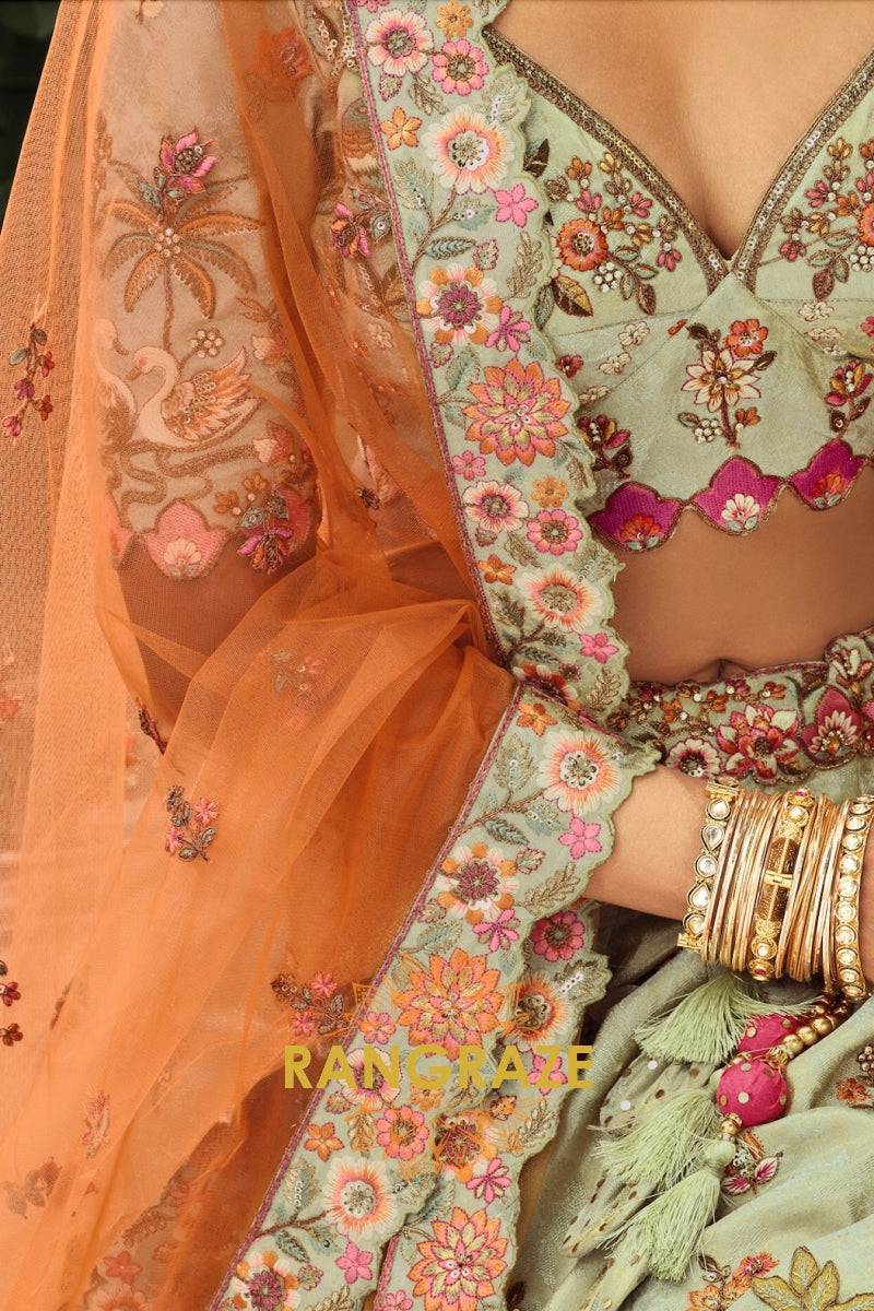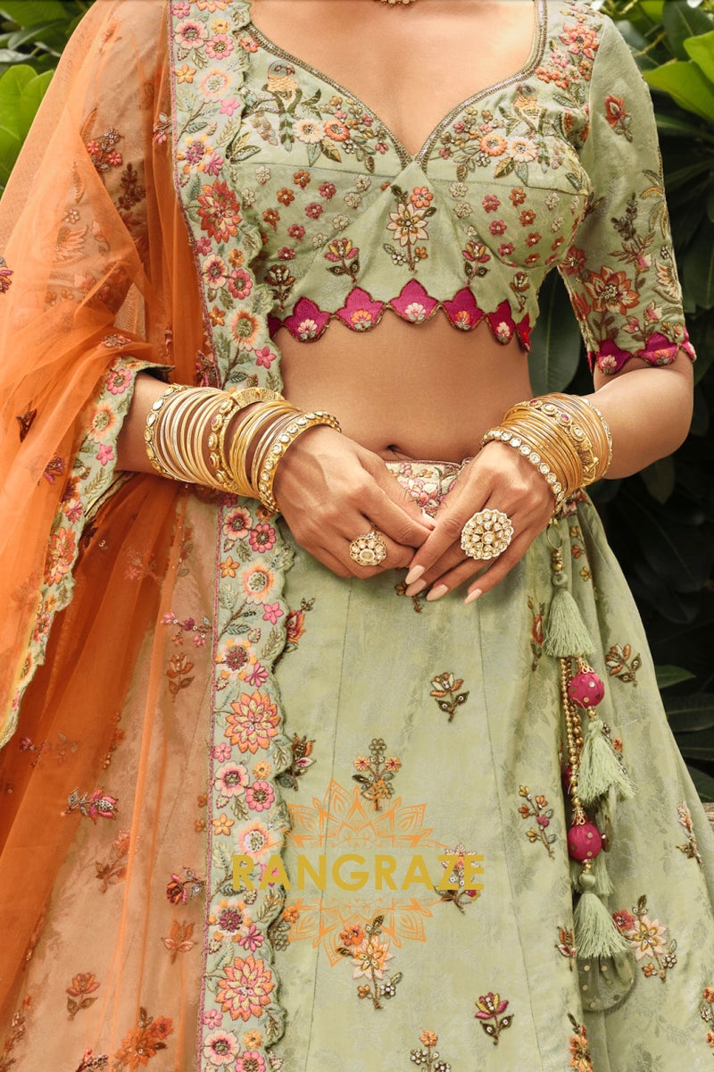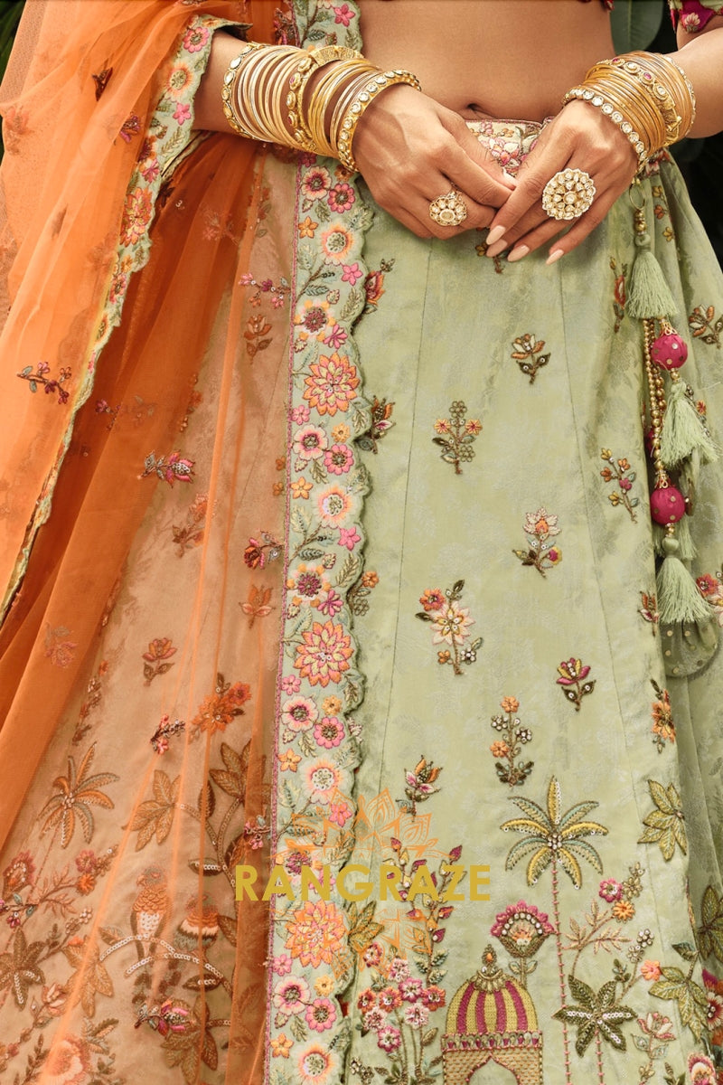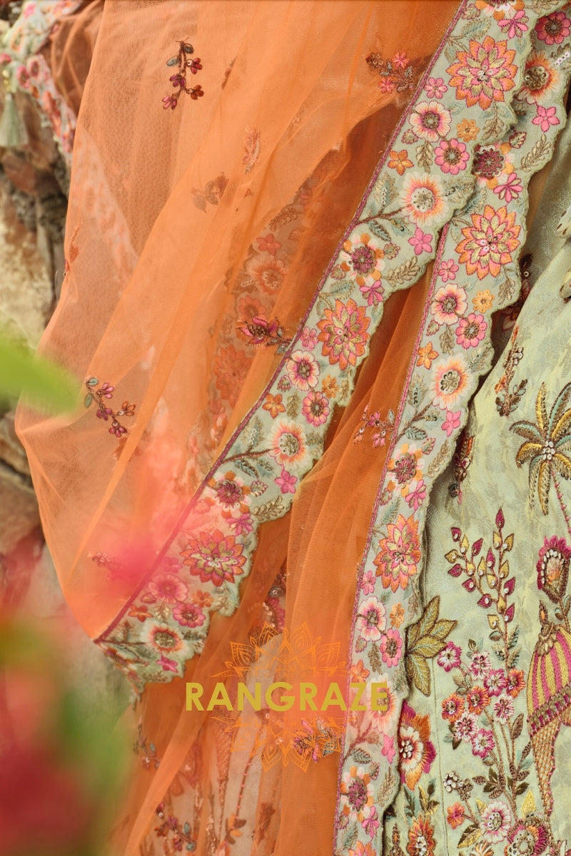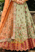 Embrace soft elegance with this Sage Green & Peach Ready-to-Wear Floral Embroidered Lehenga, a beautifully balanced ensemble that blends pastel charm with intricate craftsmanship, ideal for weddings, festive occasions, and refined celebrations.