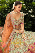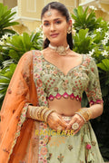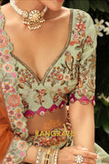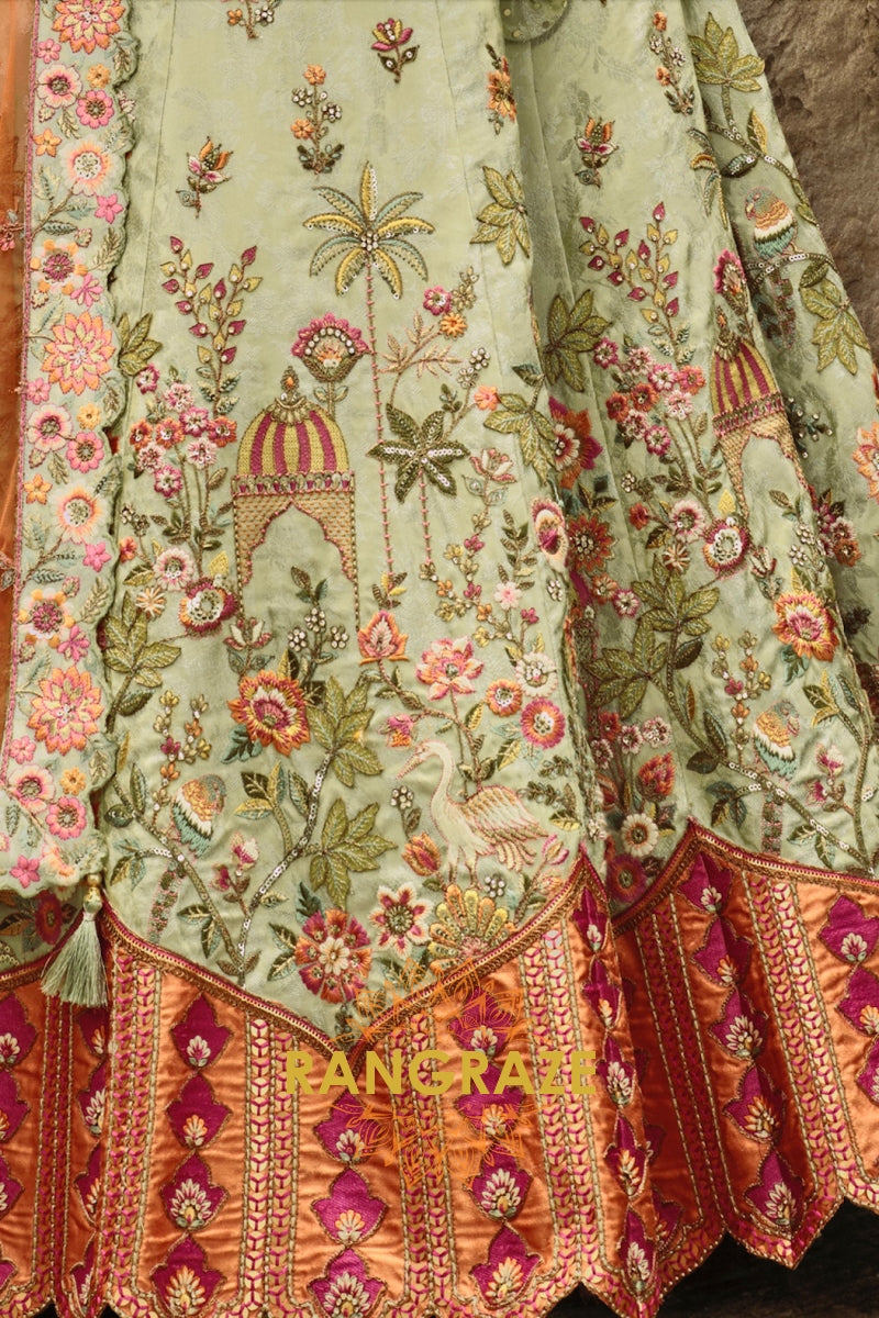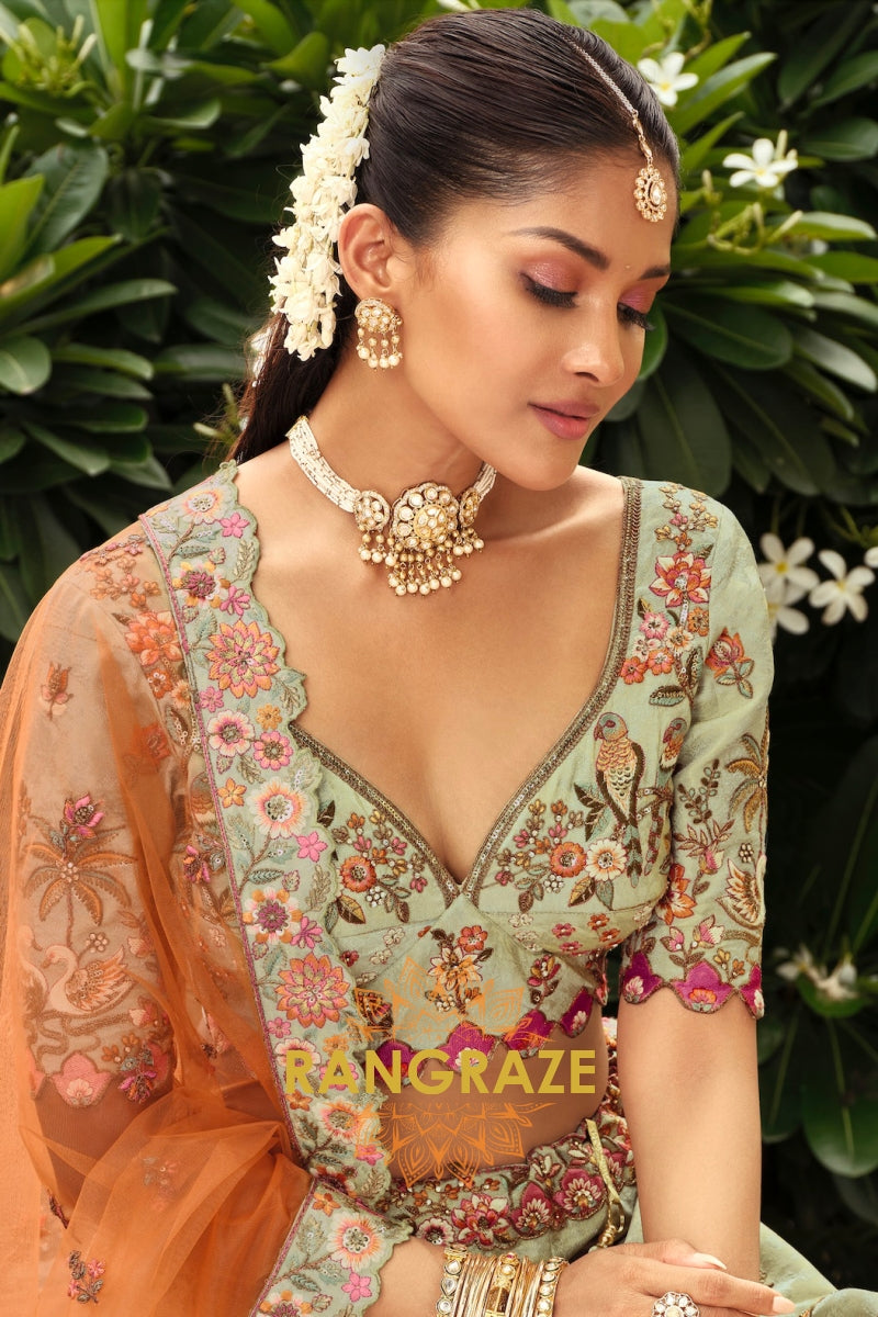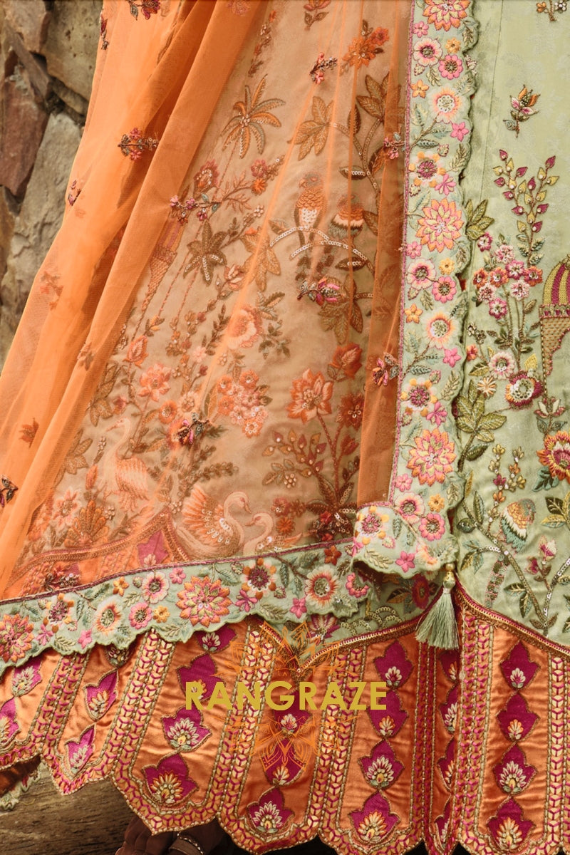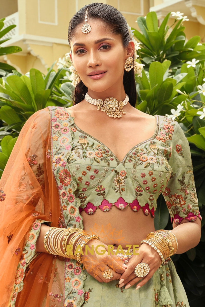 Embrace soft elegance with this Sage Green & Peach Ready-to-Wear Floral Embroidered Lehenga, a beautifully balanced ensemble that blends pastel charm with intricate craftsmanship, ideal for weddings, festive occasions, and refined celebrations.