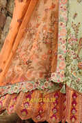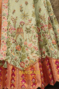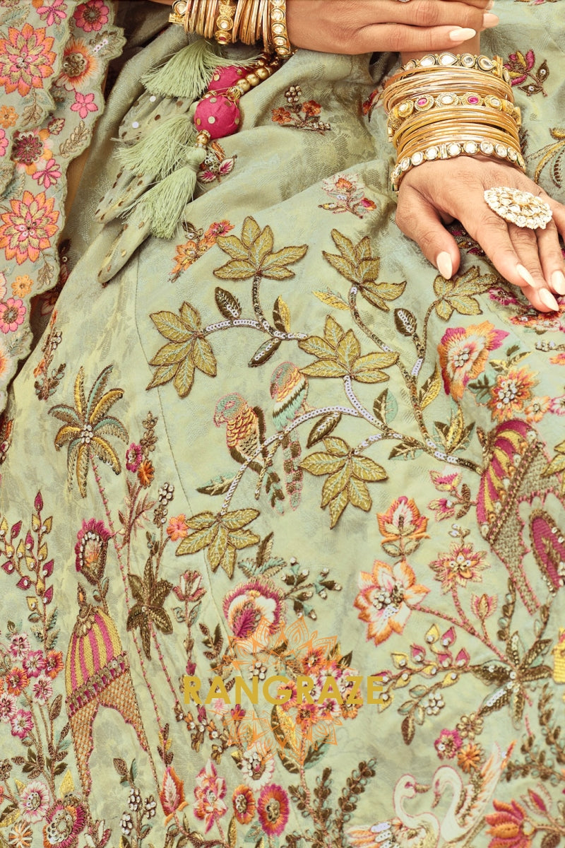 Crafted in a soothing sage green hue, the lehenga is adorned with delicate floral and heritage-inspired motifs that lend it a graceful, timeless appeal. Rich detailing includes heavy embroidery, weaving butti, artistic mirror work, and an intricately finished cut-work border that adds depth and refinement. With a flattering 42-inch length and a flowing 3.50-meter flair, this ready-to-wear lehenga creates an elegant silhouette with effortless movement.