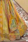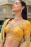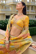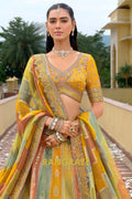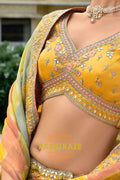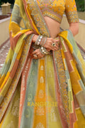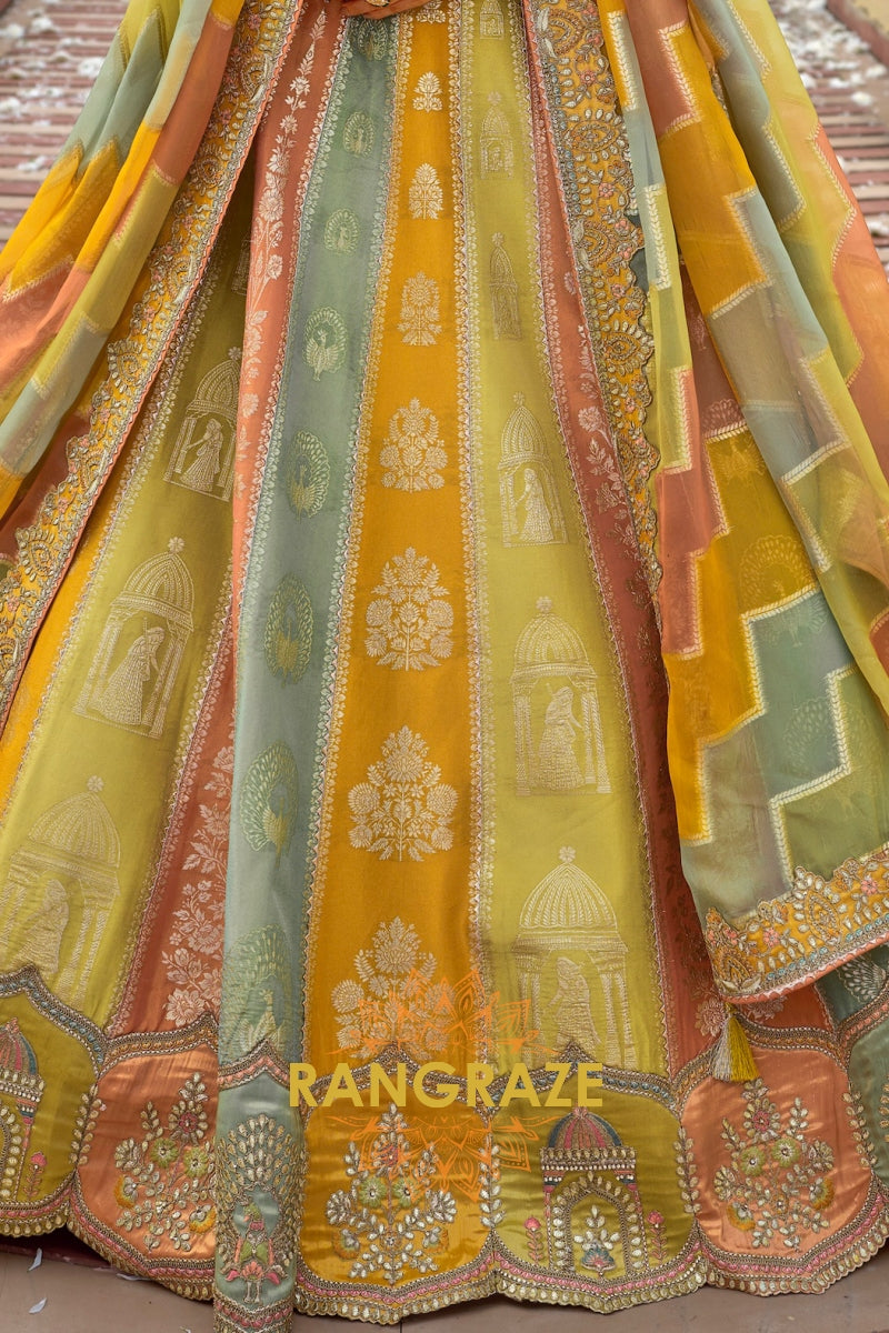 Designed in a harmonious palette of mustard yellow, sage green, and soft peach panels, the lehenga features intricate traditional motifs inspired by temple architecture, florals, and heritage patterns. Detailed embroidery using resham, zari, sequins, stone, and subtle mirror work enhances the richness of each panel. The heavily embellished scalloped hem adds depth and grandeur, while the voluminous 4.2-meter ghera ensures an elegant and regal flare.