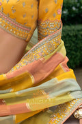 The coordinating mustard blouse is delicately embroidered with fine floral and geometric detailing. Featuring a flattering V-neckline and elbow-length sleeves, it offers a perfect balance of traditional craftsmanship and modern silhouette, making it effortlessly elegant.