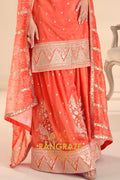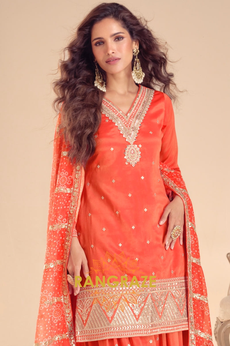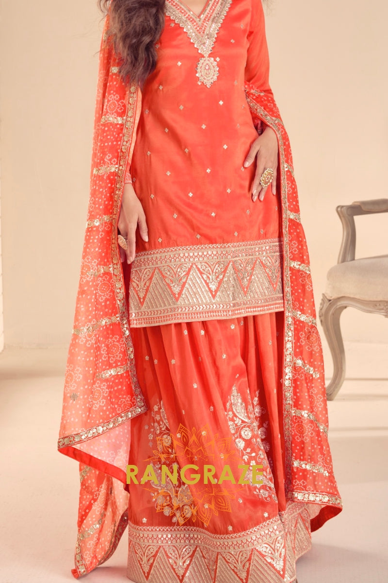 Turn heads at every celebration with this radiant Sunset Glow Premium Shimmer Silk Sharara Suit Set, designed to embody elegance, tradition, and modern grace. Crafted from luxurious shimmer silk fabric, this ensemble features a rich sunset-orange hue that reflects light beautifully, creating a luminous festive look.