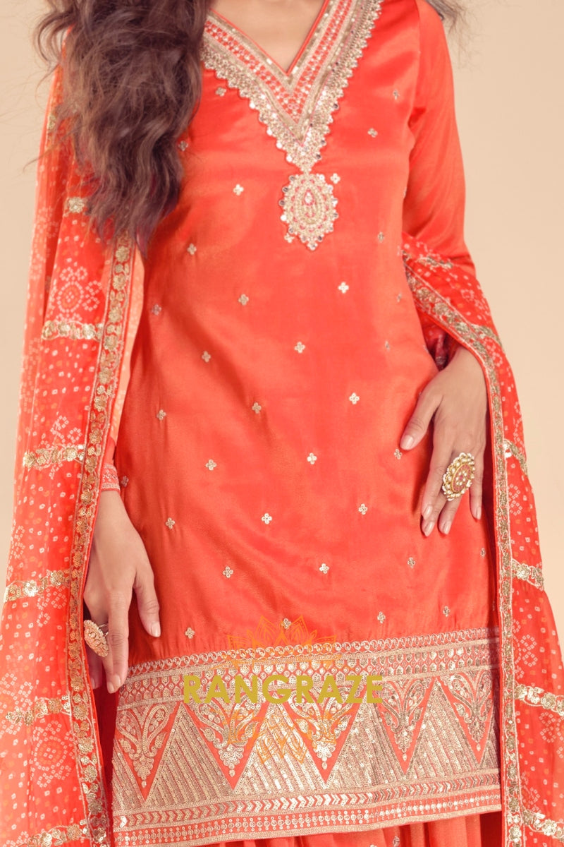 Sunset Glow Premium Shimmer Silk Embroidered Sharara Suit Set