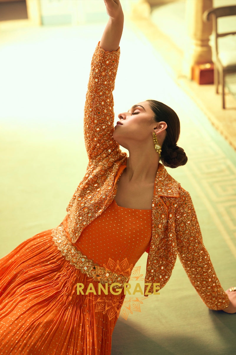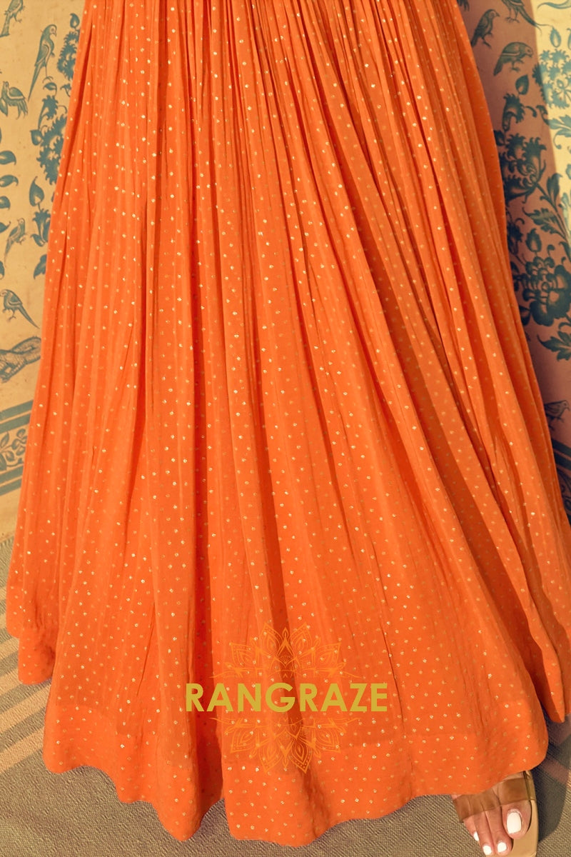 Radiate vibrant elegance with this Tangerine Glow Georgette Gown, a perfect fusion of modern sophistication and festive grandeur. The sleeveless gown, crafted in premium georgette, features delicate sequin embroidery that creates a subtle shimmer across its flowing pleated silhouette. Its flattering fit-and-flare cut adds graceful movement, making it a standout piece for celebrations.