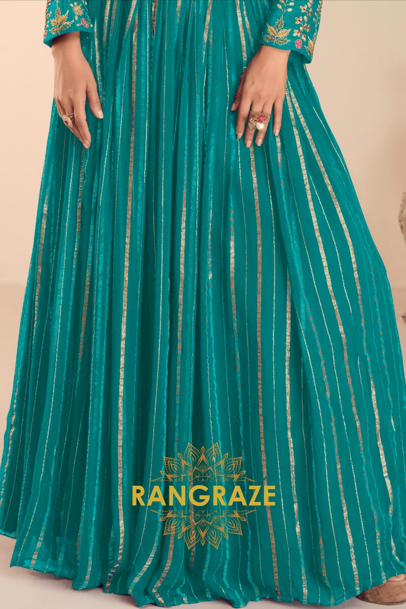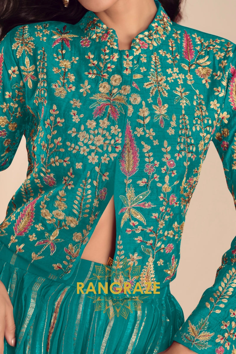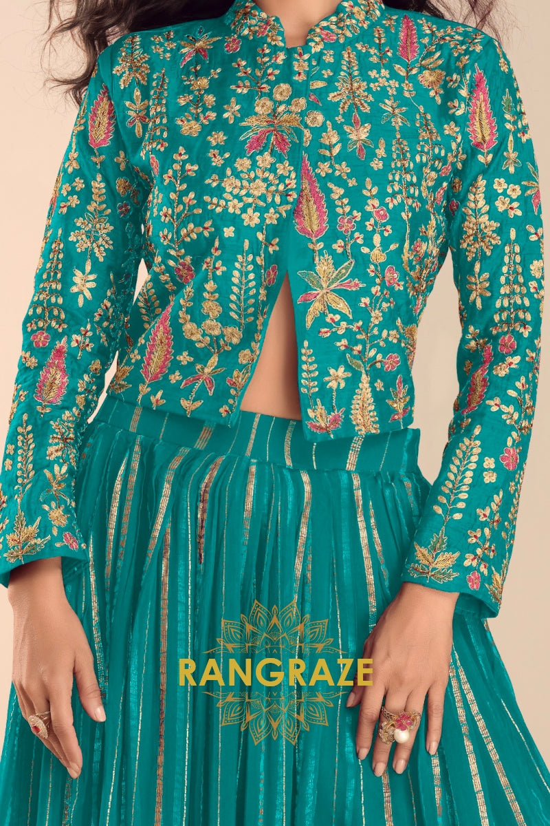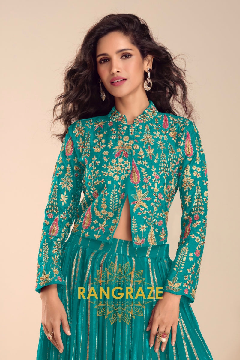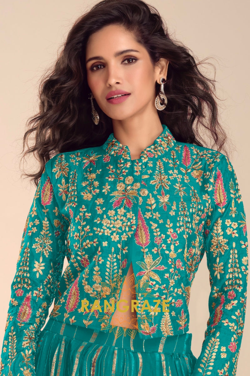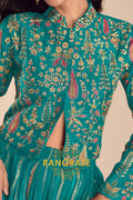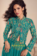 Bring vibrant elegance to your festive wardrobe with this stunning Teal Green Embroidered Lehenga Jacket Suit Set, designed for modern celebrations with a traditional soul.