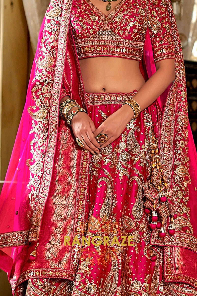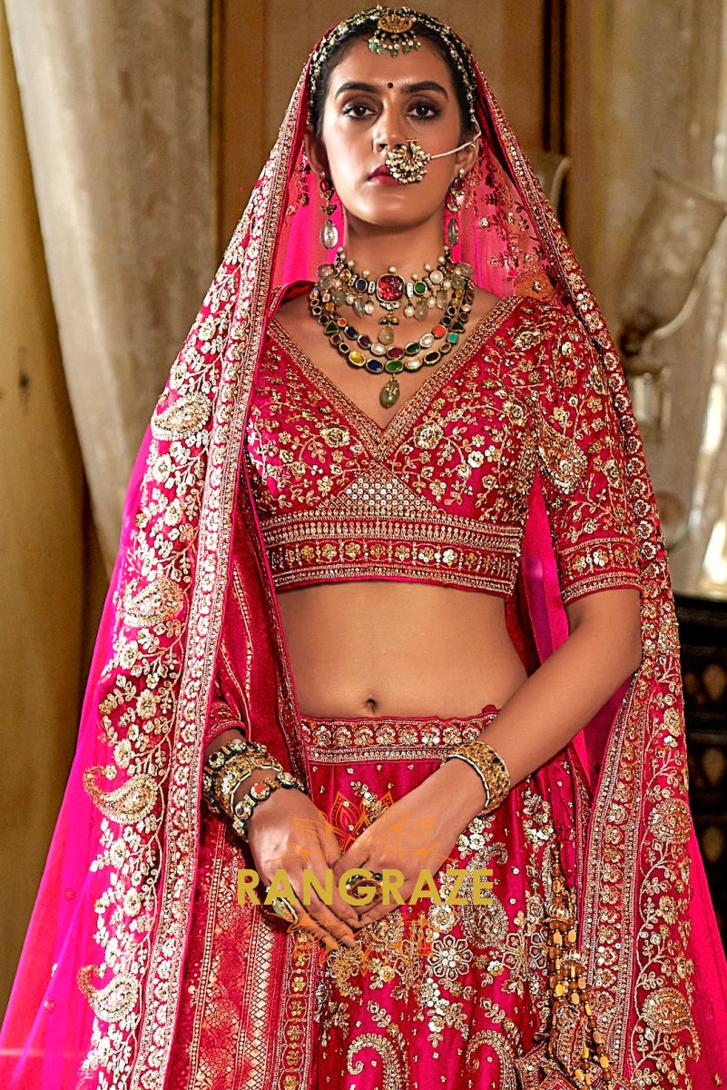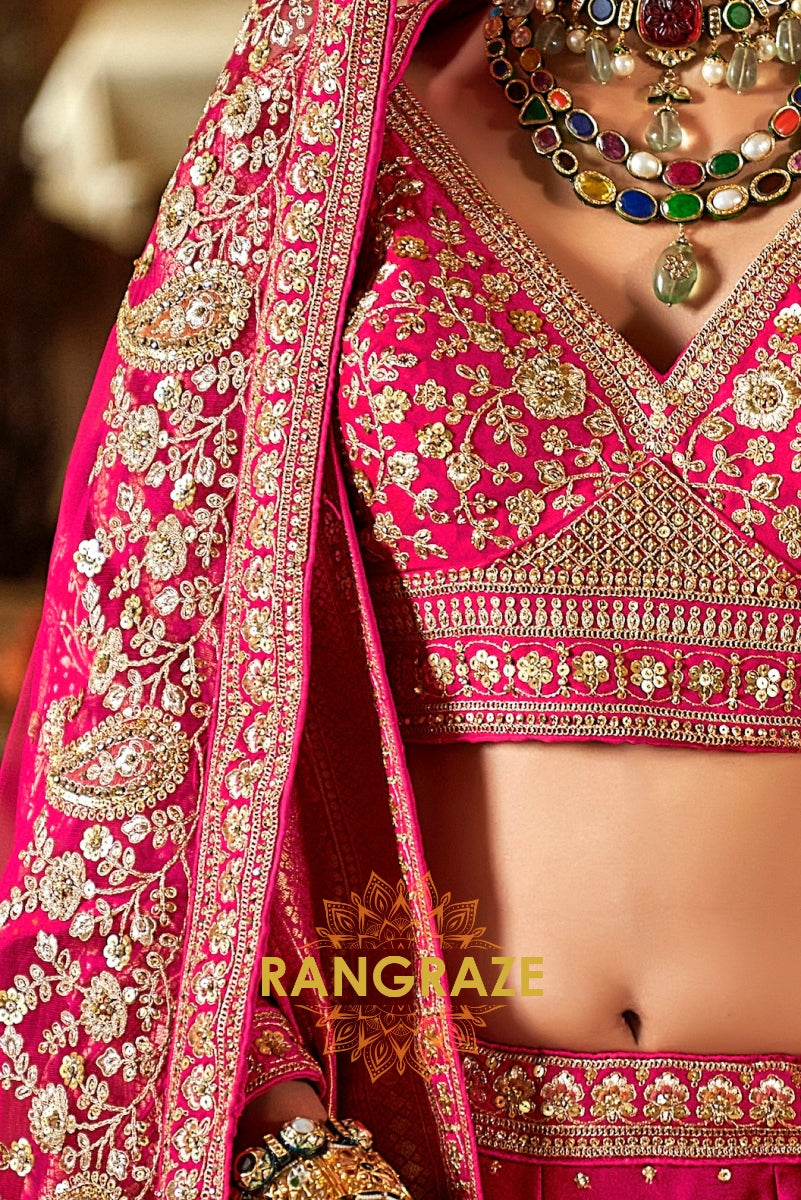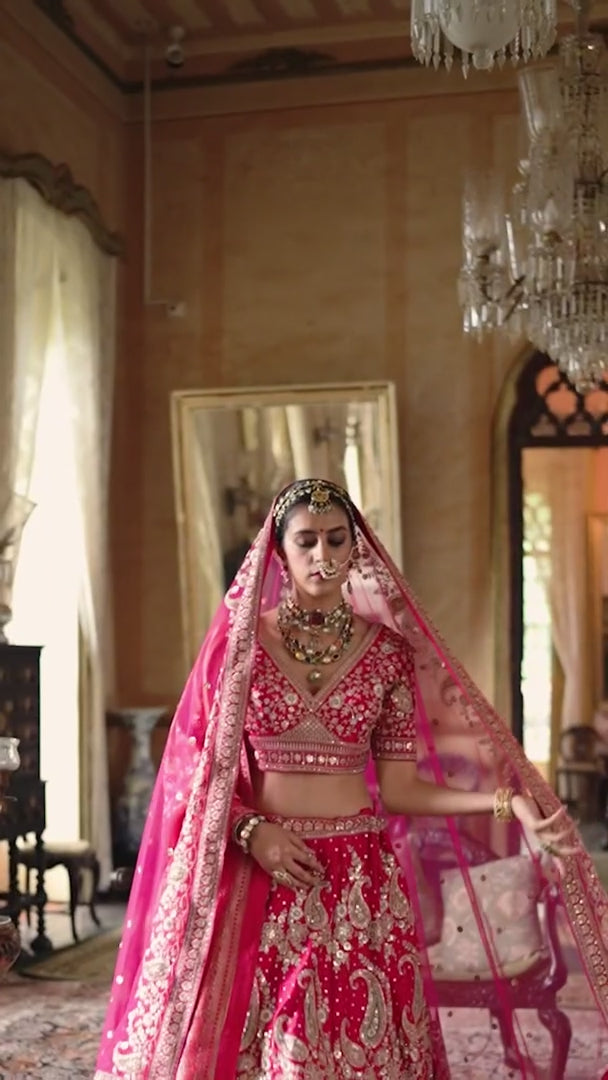 Step into your wedding day with the Rosé Heritage Bridal Silk Lehenga, a masterpiece that embodies the grandeur of Indian bridal couture with timeless elegance. Inspired by Sabyasachi’s regal artistry, this ensemble celebrates the bride who desires tradition with a touch of royal opulence.