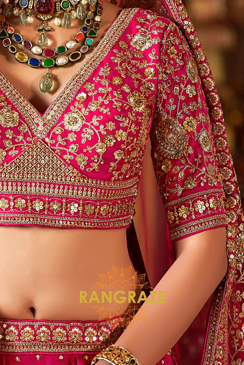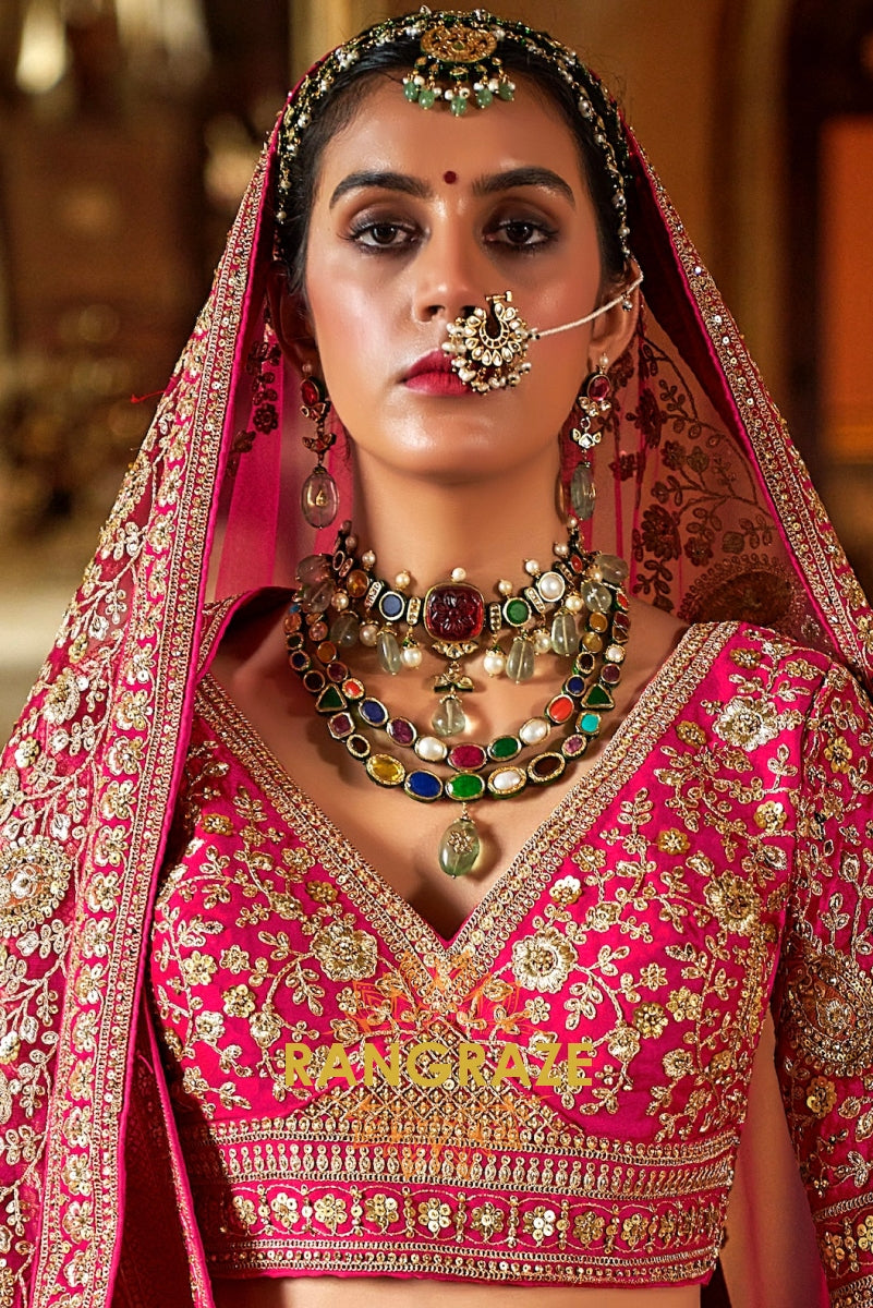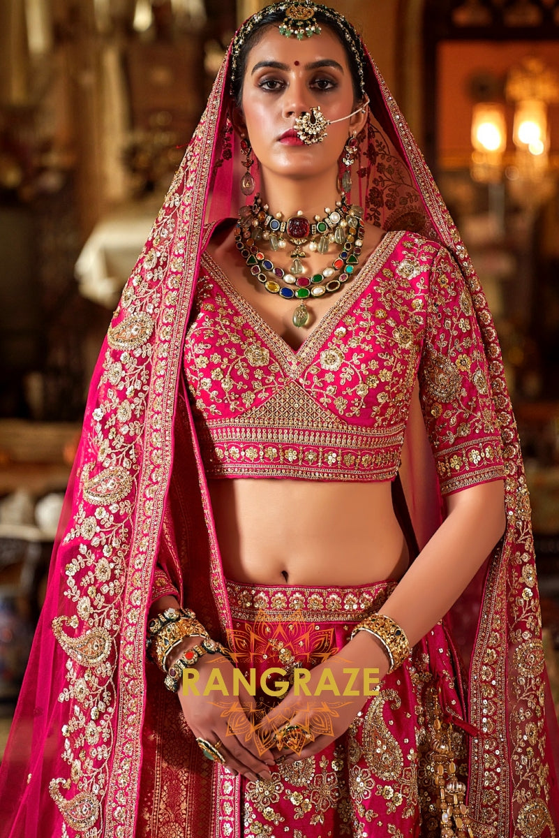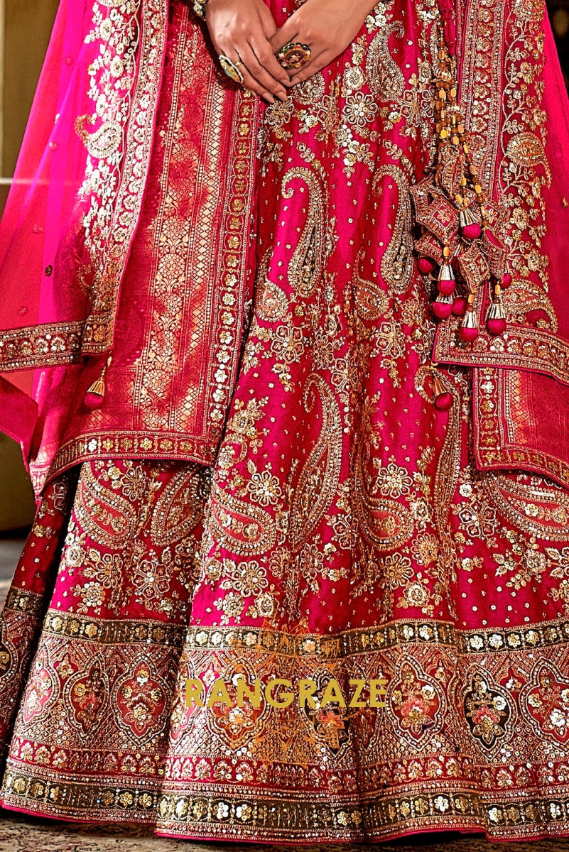 Step into your wedding day with the Rosé Heritage Bridal Silk Lehenga, a masterpiece that embodies the grandeur of Indian bridal couture with timeless elegance. Inspired by Sabyasachi’s regal artistry, this ensemble celebrates the bride who desires tradition with a touch of royal opulence.