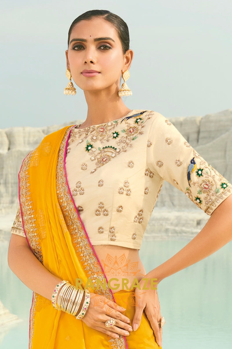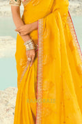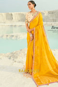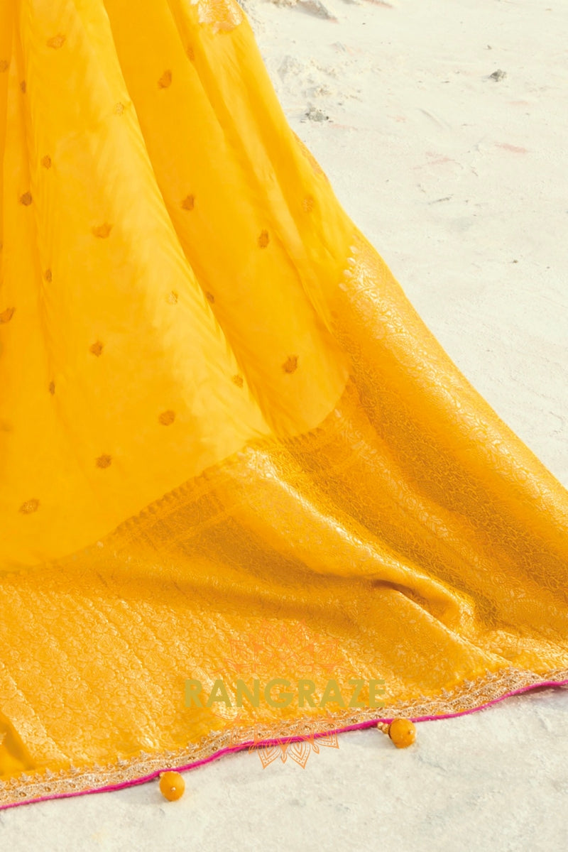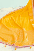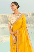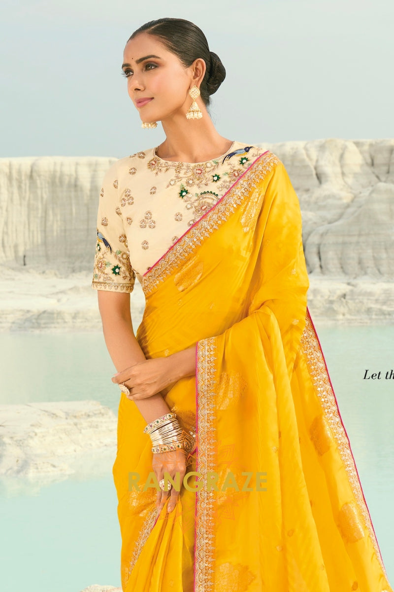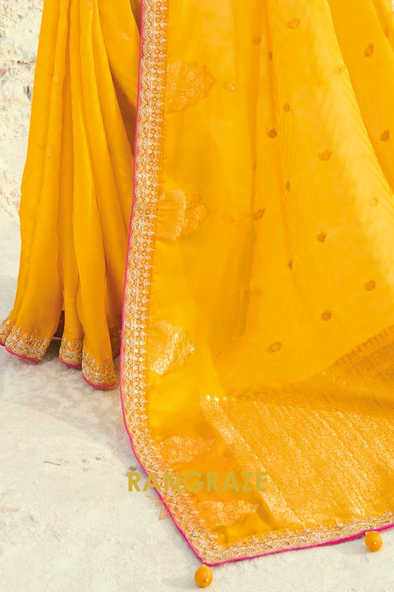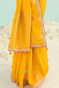 Crafted in luxurious pure silk fabric, this vibrant yellow saree showcases subtle yet rich embroidery inspired by classic floral and traditional motifs. The saree features fine zari and resham work delicately spread across the body, creating a luminous and graceful appeal. The designer pallu is beautifully enhanced with intricate embroidery and an ornate border, adding depth, richness, and a regal finish that flows effortlessly with every drape.