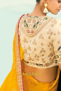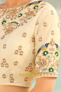 Paired with a contrasting designer blouse in pure silk fabric, the blouse is adorned with detailed embroidery that perfectly complements the saree’s elegance. The refined craftsmanship on the blouse adds structure and sophistication, completing the ensemble with a luxurious touch.