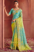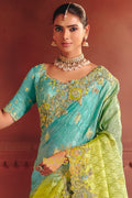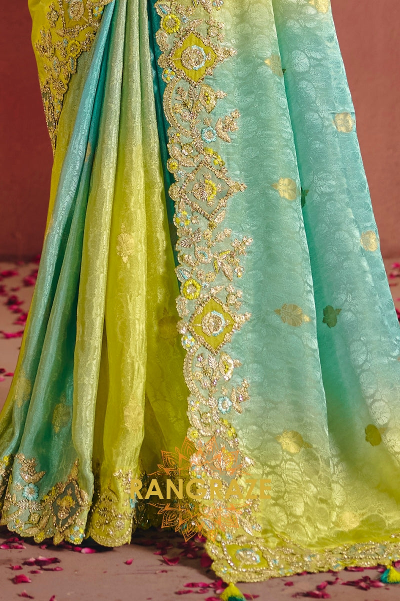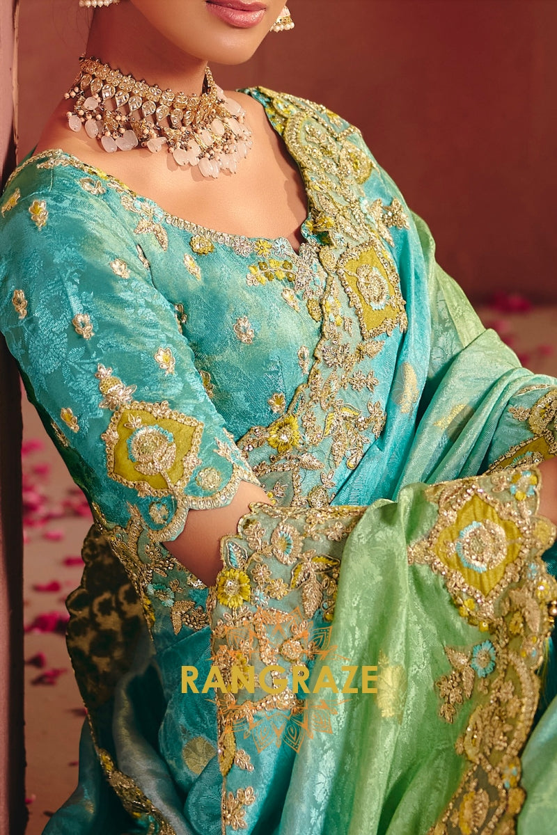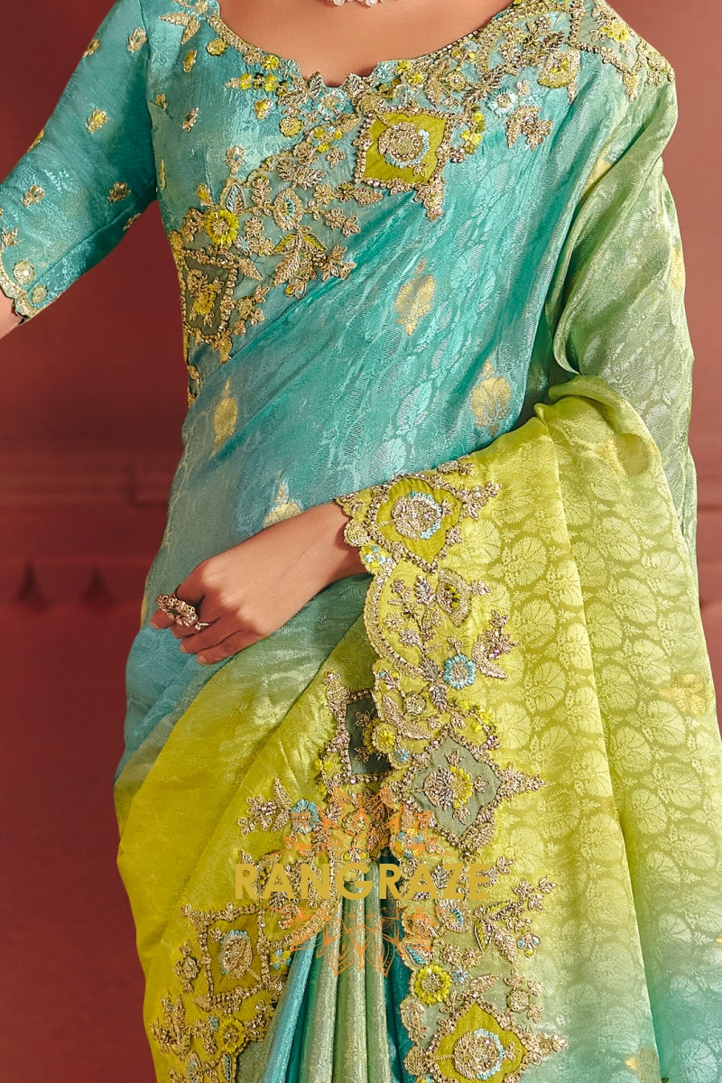 Adorned with heavy embroidery enhanced by intricate thread work, shimmering sequins, and detailed motifs, the saree highlights ornate patterns along the border and pallu. The graceful blend of aqua blue and lime green hues creates a vibrant yet sophisticated appeal, ideal for weddings and festive occasions.