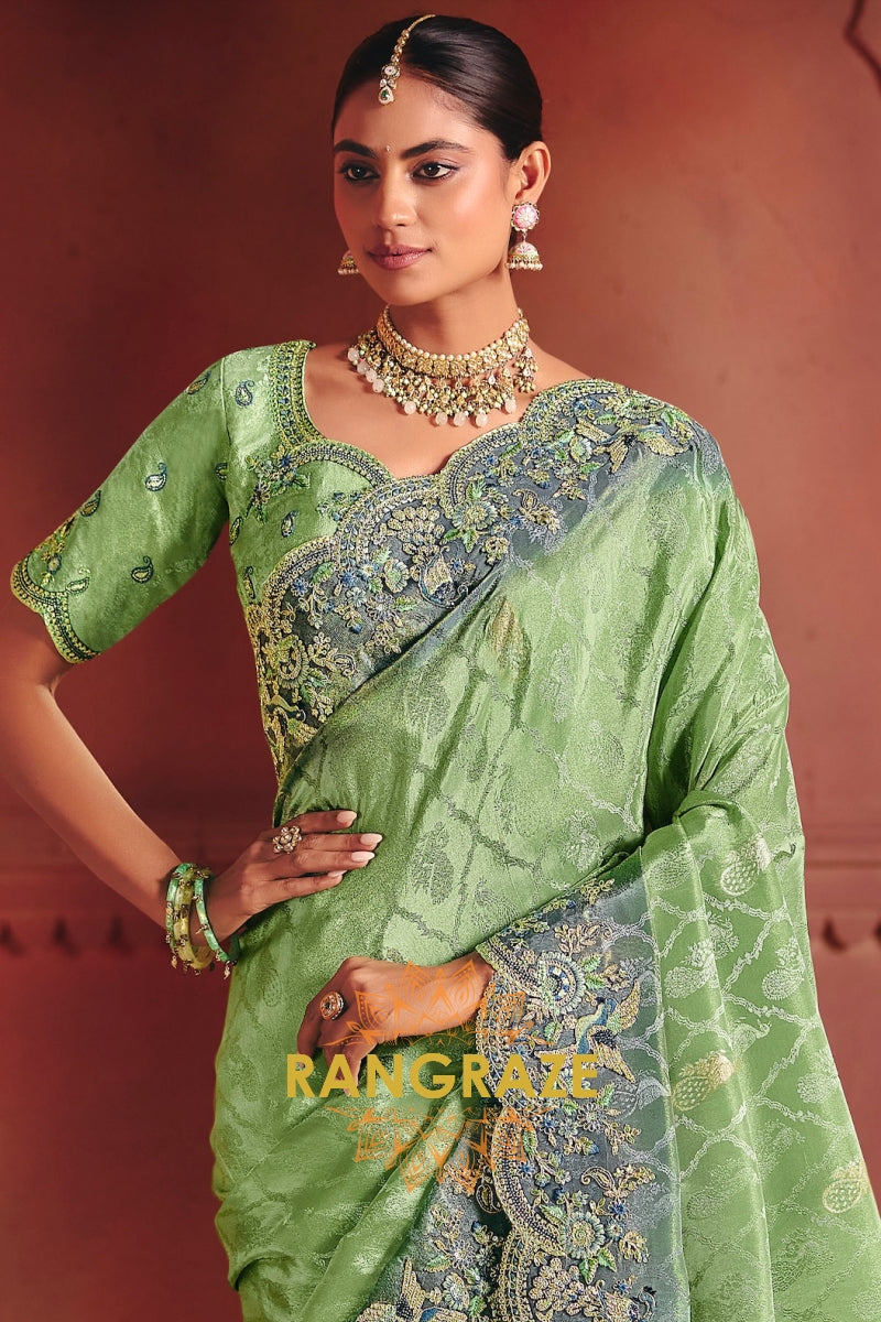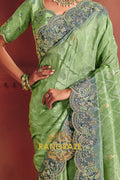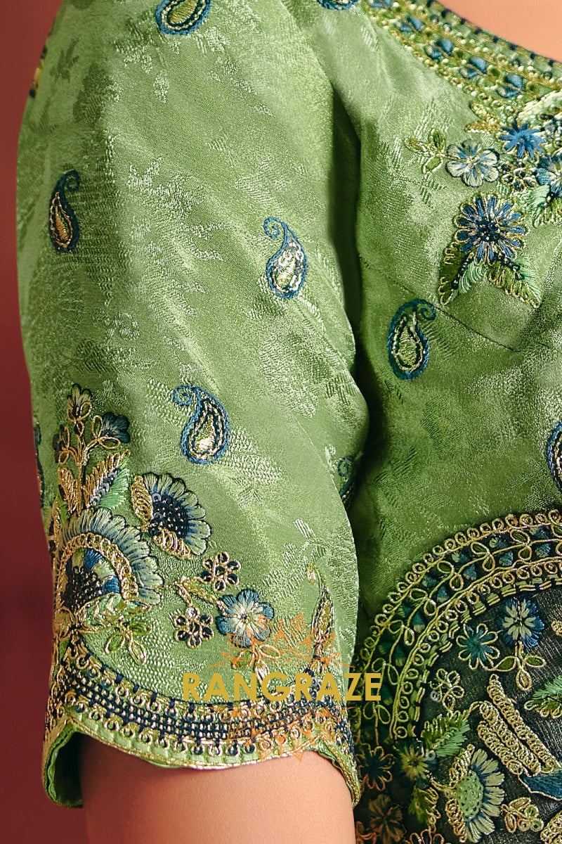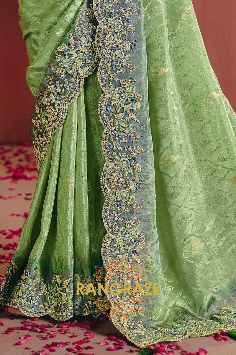 The saree is enhanced with heavy embroidery showcasing intricate thread work, shimmering sequins, and finely detailed motifs along the border and pallu. The elegant green base paired with contrasting embroidery adds depth and sophistication, creating a regal and festive appeal.