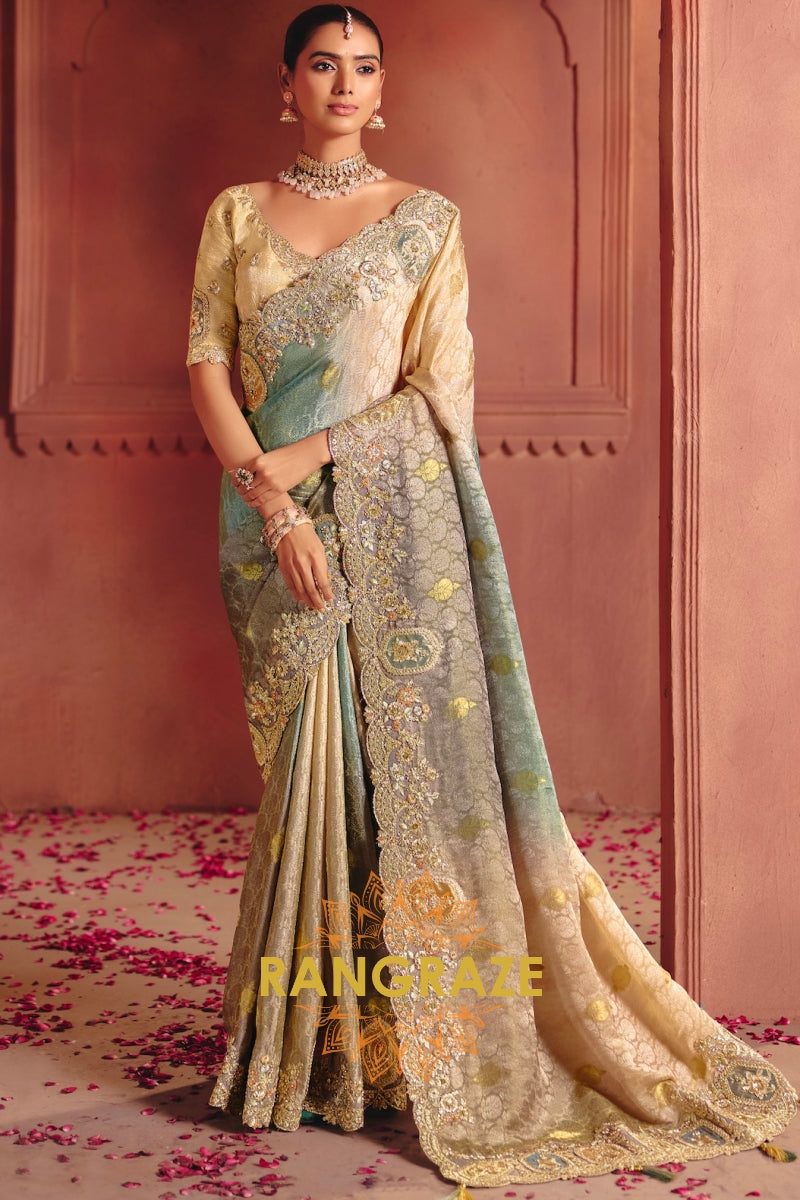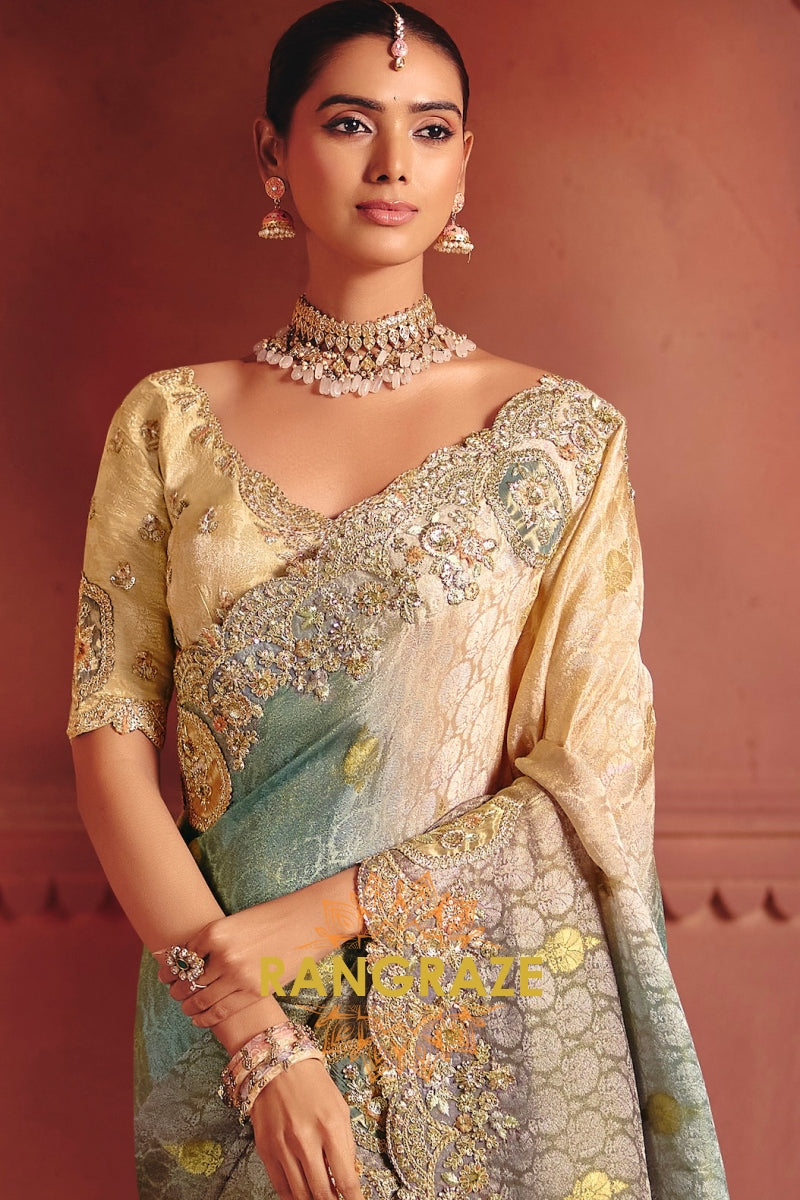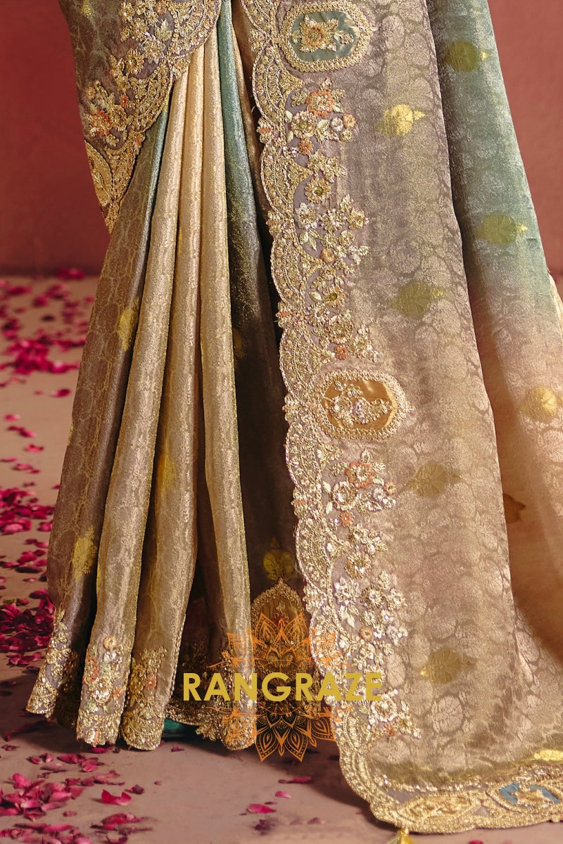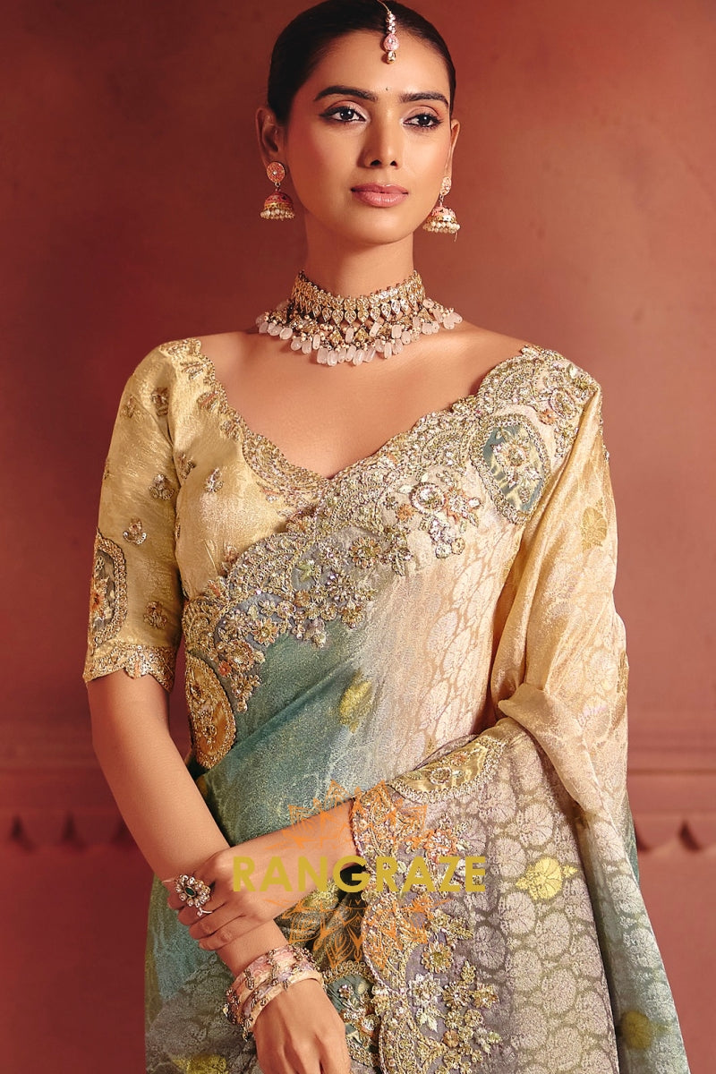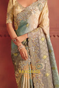 The saree is beautifully adorned with heavy embroidery showcasing detailed thread work, shimmering sequins, and ornate motifs along the border and pallu. The sophisticated blend of ivory, sage green, and soft gold tones creates a timeless and graceful look, perfect for elegant celebrations.